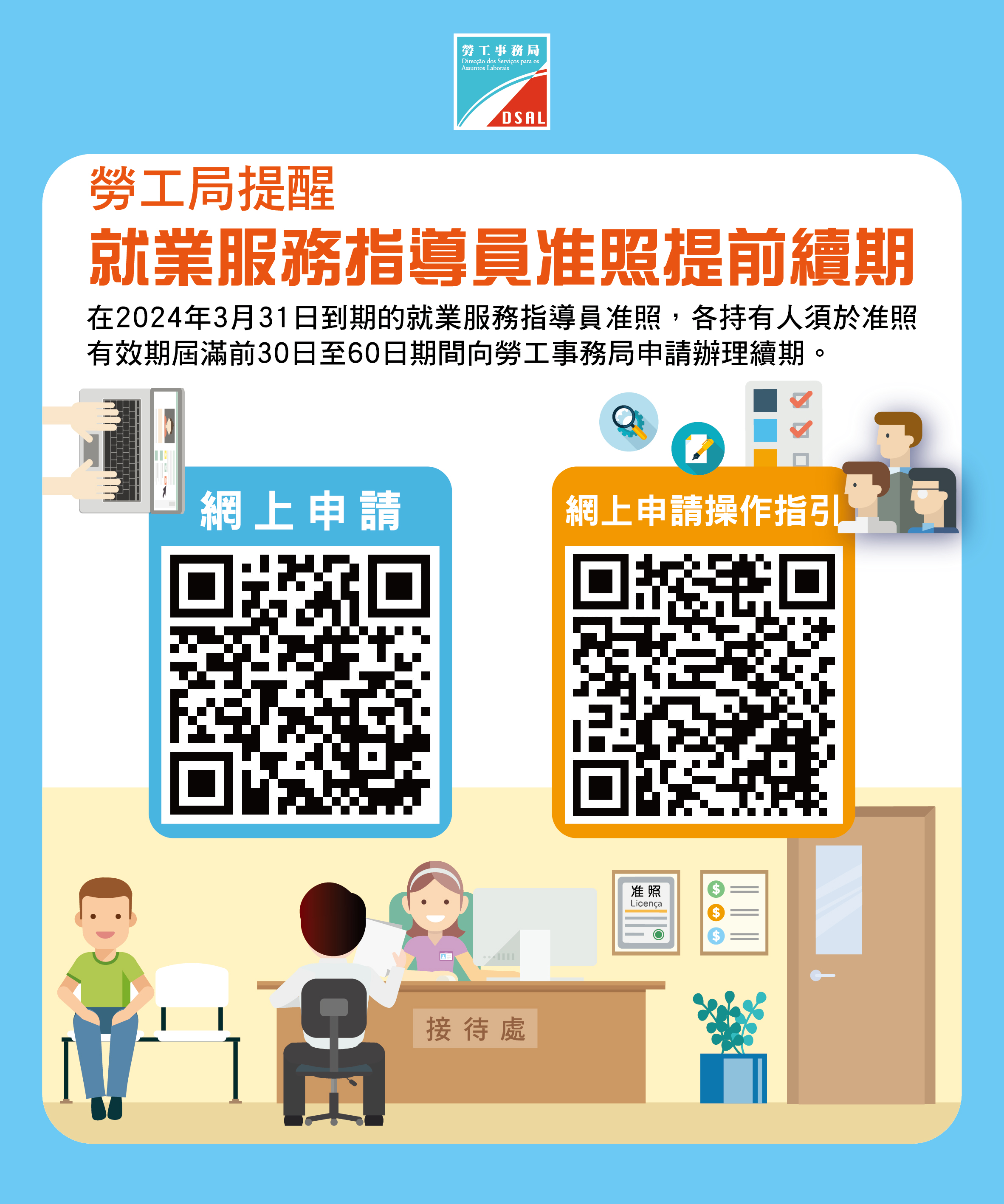 按照第16/2020號法律《職業介紹所業務法》規定,在2024年3月31日到期的就業服務指導員准照,各持有人須於准照有效期屆滿前30日至60日期間(即於2024年2月1日起)向勞工事務局申請辦理續期。倘少於30日前提出,須額外繳付多1倍續期費用;另倘有效期屆滿前仍未提出,准照會被註銷。因此,准照持有人務必於法定期間內提出續期申請及提交所需的申請文件。辦理續期可透過掃瞄二維碼於網上申請或以紙本方式提交。