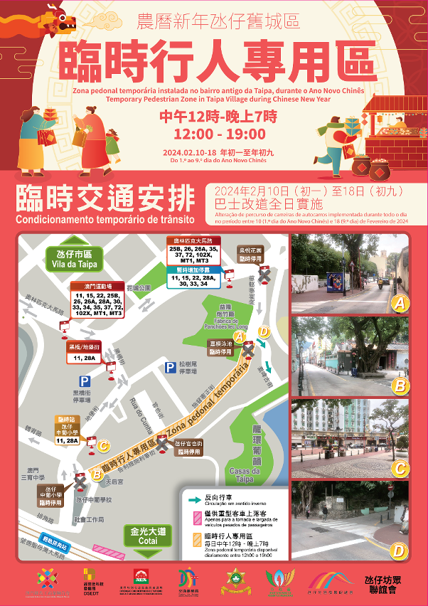經研究及評估過去情況,於2月10日至18日(年初一至年初九)中午12時至晚上7時,在氹仔舊城區設置臨時行人專用區。