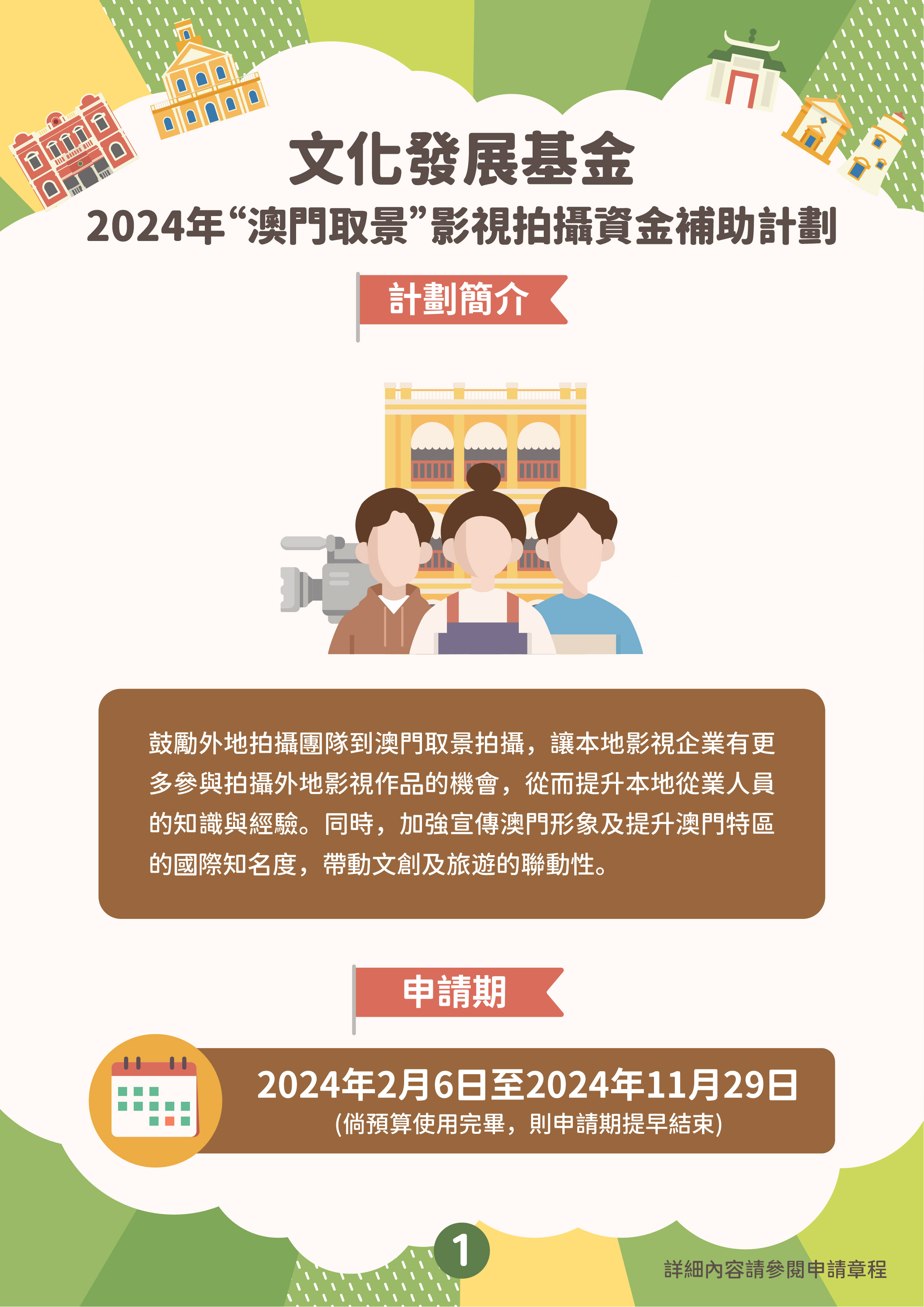 兩項資助計劃由2024年2月6日開始接受申請,最後接受申請限期為2024年11月29日,資助名額不限,直至相關資助計劃預算使用完畢為止,屆時申請期將同時提早結束,基金將在網站對外公佈有關訊息。兩項計劃的獲資助作品類型包括電視劇、電影、紀錄片、綜藝節目、音樂錄像及廣告片,但不包括動畫作品。
