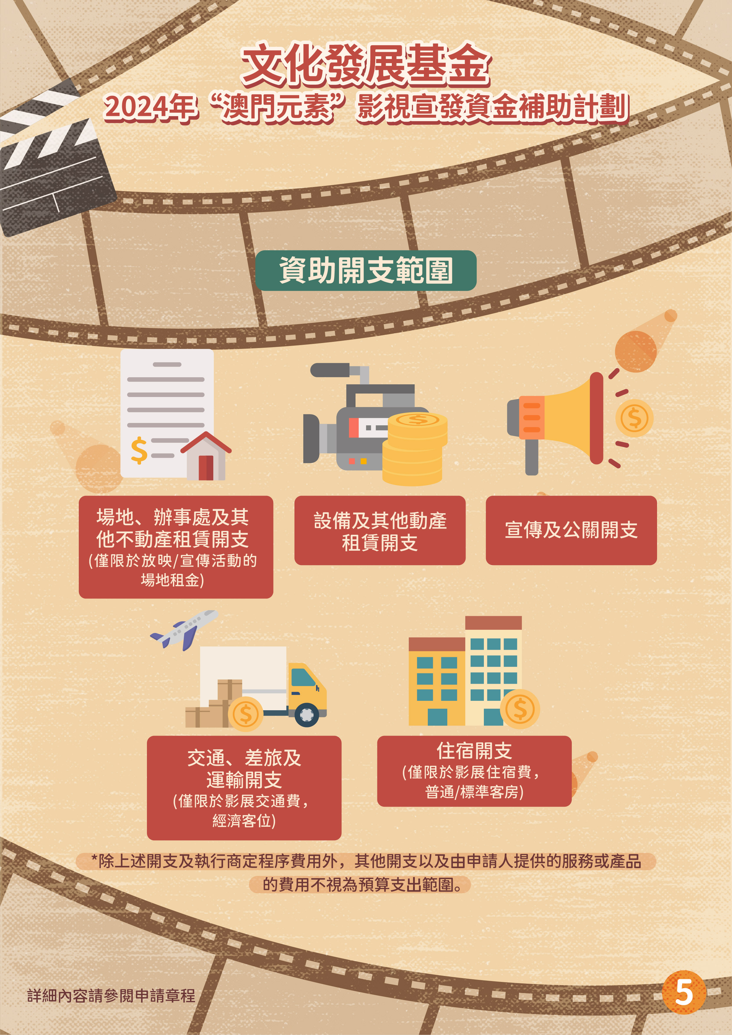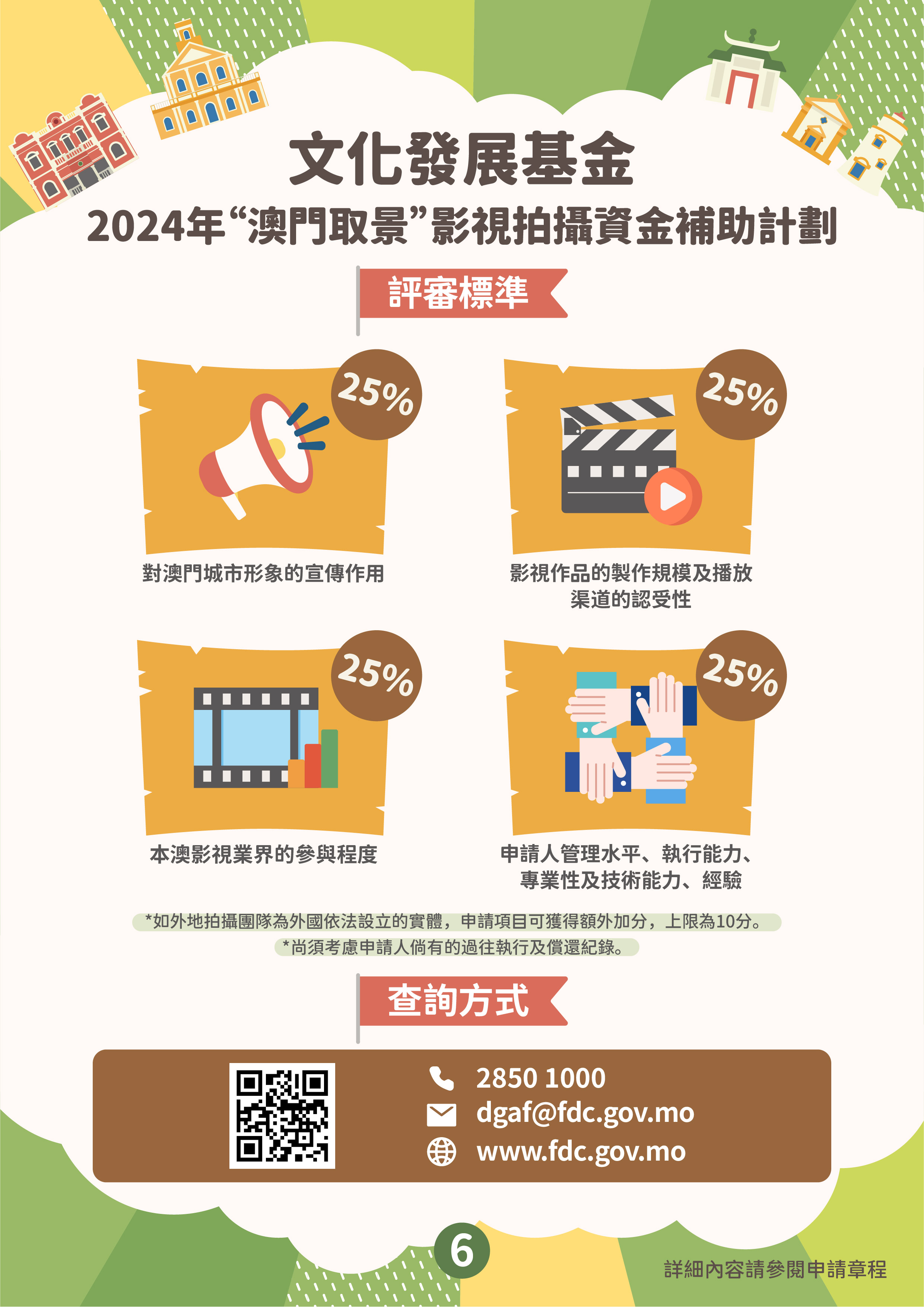 文化發展基金推出“澳門元素”影視宣發資金補助計劃、“澳門取景”影視拍攝資金補助計劃,支持具澳門元素影視作品投入市場,加強宣傳澳門城市形象及提升國際知名度,帶動文創及旅遊的聯動性,推動澳門影視產業發展。