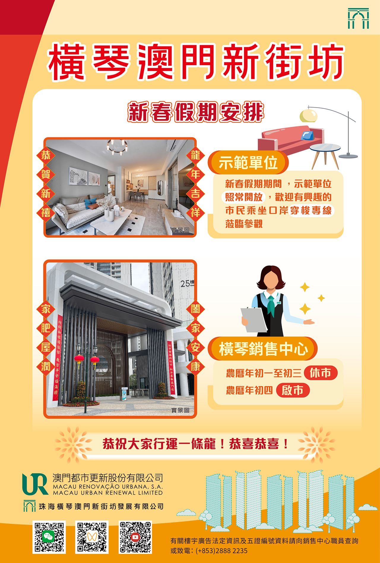另外,橫琴銷售中心將於2月10至12日(農曆年初一至初三) 休息三天,並於2月13日(農曆年初四)啟市。敬請留意。