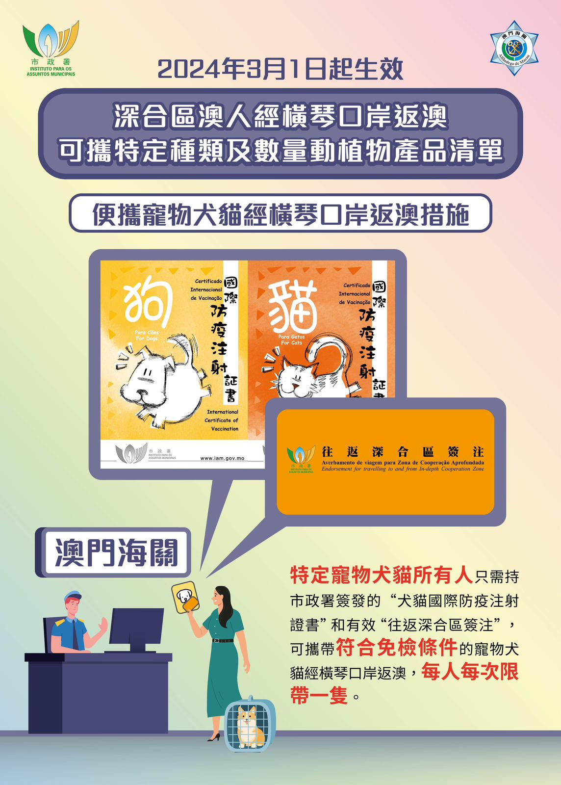 配合深合區“一線放開,二線管住”分線管理模式更好地落實,實現澳門與深合區之間進一步便捷流通。自3月1日起,在橫琴粵澳深度合作區學習、就業、創業或生活,且已納入“允許澳門居民攜帶相關動植物產品進入橫琴粵澳深度合作區的適用人員名單庫”(“適用人員名單庫”)的澳門居民,可攜帶供其本人自用,且符合特定種類及數量的食品及鮮花等動植物產品經橫琴口岸返回澳門,無需申請進口准照或作出相關申報。而對於已被納入上述“適用人員名單庫”的寵物犬貓所有人,若名下的犬貓已在市政署植入電子晶片,只需持有市政署簽發的“犬貓國際防疫注射證書”和有效“往返深合區簽注”,亦可攜同符合免檢條件的寵物犬貓經橫琴口岸返澳。上述通關檢疫便利措施及新安排,將稍後透過行政長官批示方式頒布。