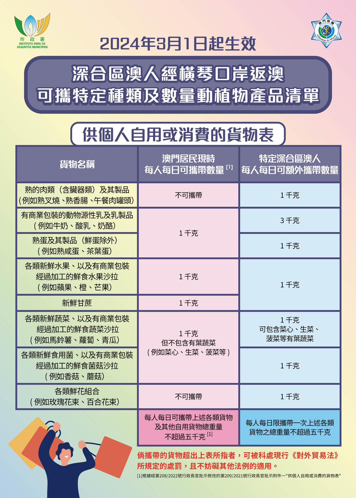 配合深合區“一線放開,二線管住”分線管理模式更好地落實,實現澳門與深合區之間進一步便捷流通。自3月1日起,在橫琴粵澳深度合作區學習、就業、創業或生活,且已納入“允許澳門居民攜帶相關動植物產品進入橫琴粵澳深度合作區的適用人員名單庫”(“適用人員名單庫”)的澳門居民,可攜帶供其本人自用,且符合特定種類及數量的食品及鮮花等動植物產品經橫琴口岸返回澳門,無需申請進口准照或作出相關申報。而對於已被納入上述“適用人員名單庫”的寵物犬貓所有人,若名下的犬貓已在市政署植入電子晶片,只需持有市政署簽發的“犬貓國際防疫注射證書”和有效“往返深合區簽注”,亦可攜同符合免檢條件的寵物犬貓經橫琴口岸返澳。上述通關檢疫便利措施及新安排,將稍後透過行政長官批示方式頒布。