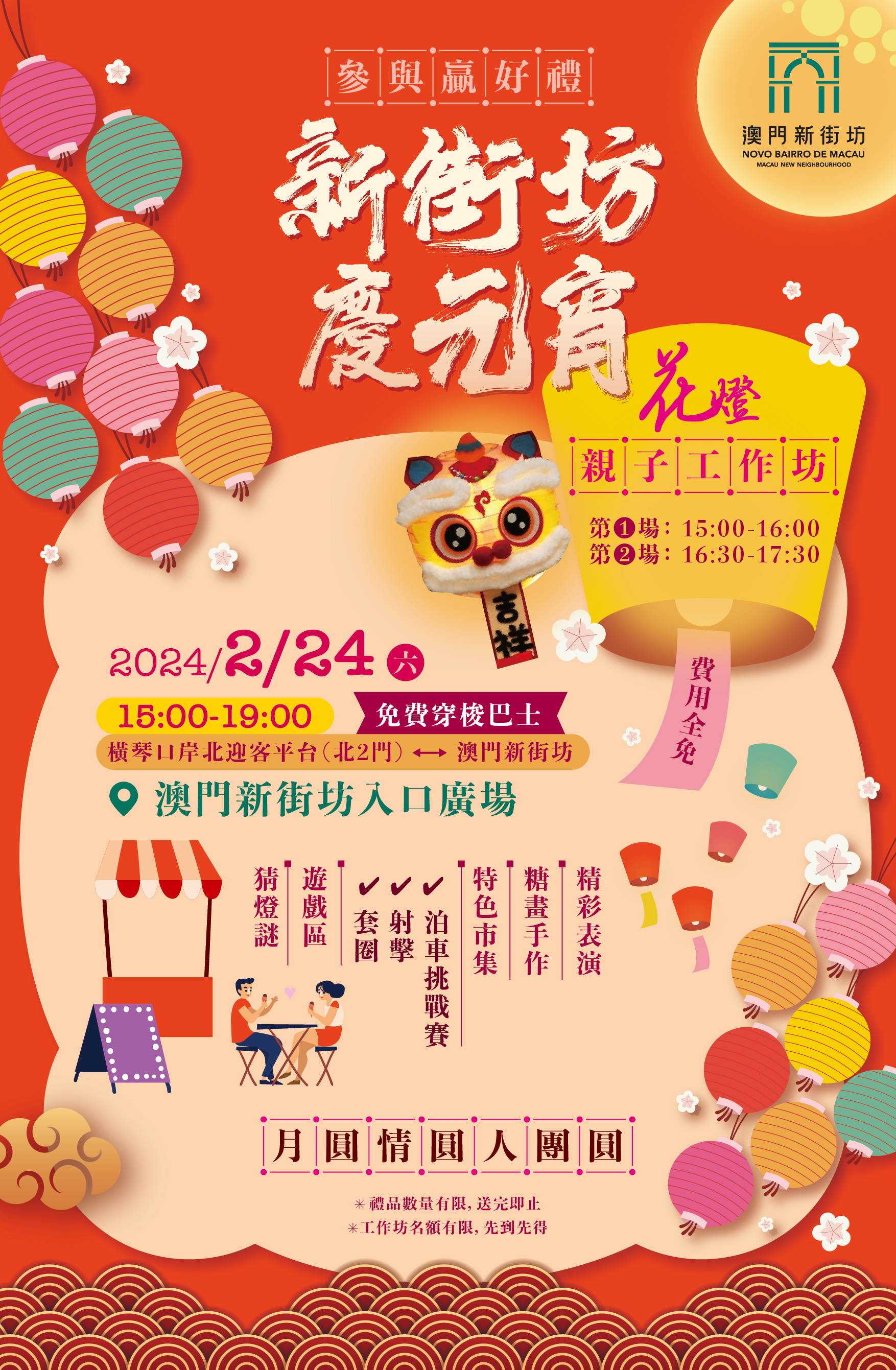 有興趣參與的市民歡迎乘坐澳門新街坊穿梭巴士,專線每十五分鐘一班次,從橫琴口岸珠方口岸北迎客平台北2門候車停泊區出發,都更公司誠邀市民攜同家人親臨澳門新街坊一起歡度元宵。