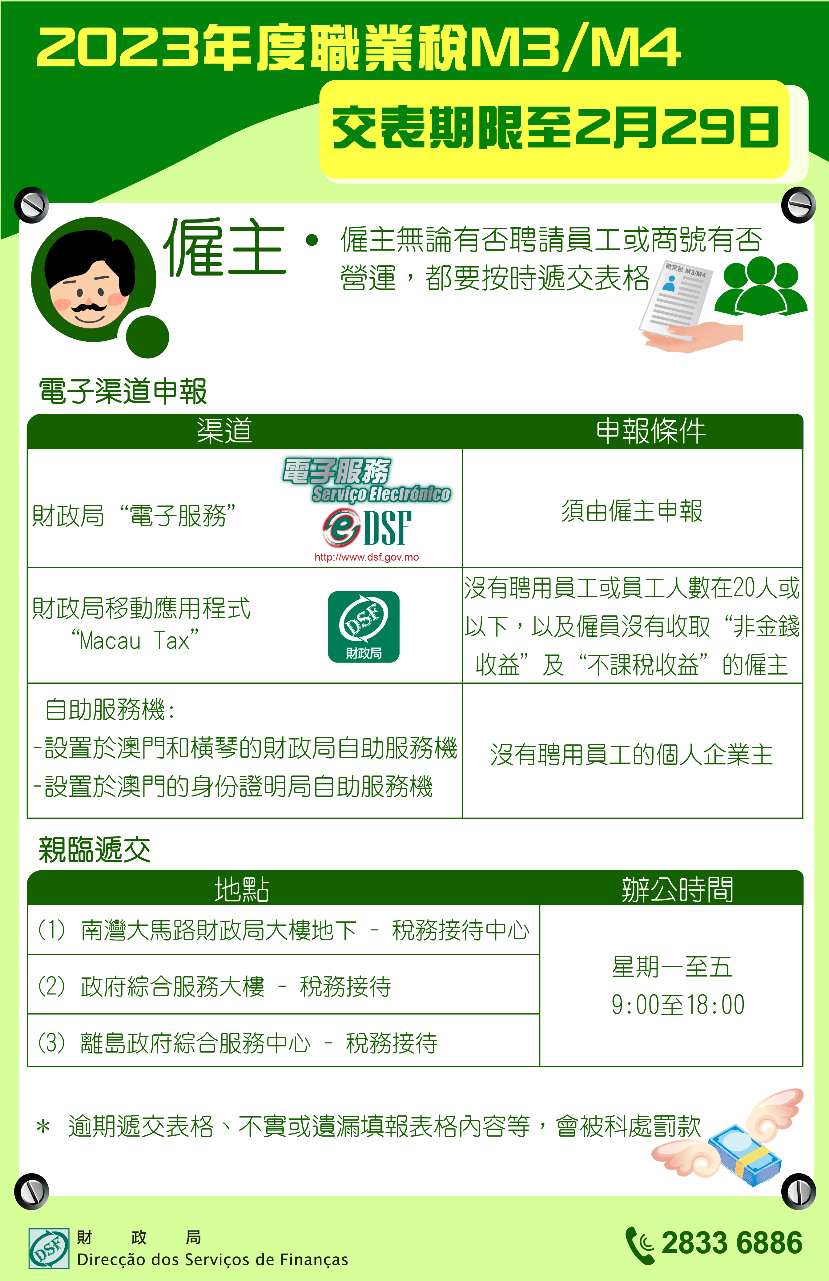 倘僱主選擇遞交M3/M4紙本表格,可於辦公時間內親臨財政局以下服務地點遞交: