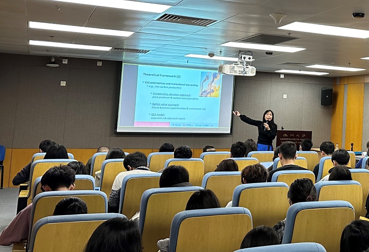講座上,傅曉青談到當前負責任投資從一種避免投資於特定產業(如煙草、酒精和博彩行業)的投資組合策略,轉變為將環境、社會和企業管治(ESG)議題整合到投資決策中的投資過程,以更好地管理風險並產生可持續及長期的投資回報。該演變引發關注,企業社會責任是否會影響機構投資者對博彩產業的投資決策。她亦探討澳門政府在ESG問題上採取的各種舉措對博彩公司機構投資人持股的影響。