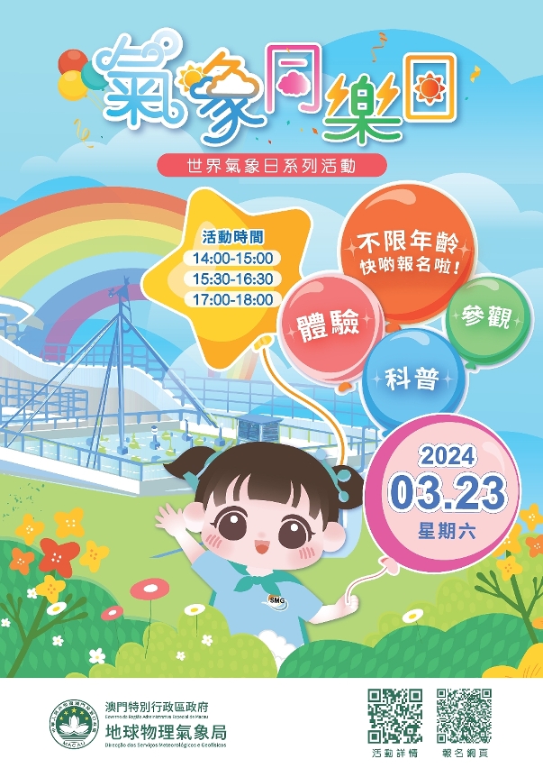 為慶祝3月23日 “世界氣象日” 及加深公眾對氣象科普知識的瞭解,地球物理氣象局將舉辦面向全澳居民的 “氣象同樂日” 活動,以及面向年滿十歲之本澳居民的“走在氣候行動最前線”氣象科普講座及參觀活動。兩項活動皆由即日(6日)起至3月10日接受網上報名,參加者於活動結束後可領取精美紀念品乙份,歡迎市民踴躍參加,一同體驗氣象科學的樂趣。