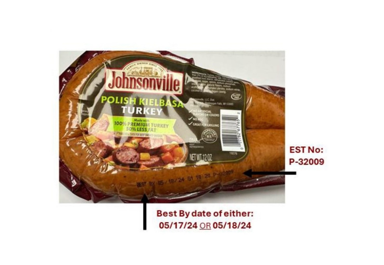 涉事之香腸產品為“Johnsonville POLISH KIELBASA TURKEY Sausage”,包裝規格:12安士(真空包裝),包裝上標示的此日期前最佳為“05/17/24”或“05/18/24”,註冊場編號(Establishment number):P-32009。