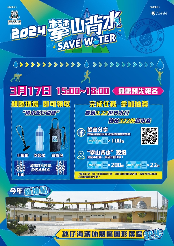 為使公眾體驗缺水地區居民攀山越嶺擔水的艱辛,海事及水務局將於3月17日(星期日)下午三時至六時,在氹仔海濱休憩區圓形廣場及步行徑舉辦“2024攀山背水”活動。海事及水務局希望藉著揹水之旅,市民可以體驗到缺水地區人民攀山越嶺擔水的艱辛,並了解澳門的水資源情況,明白澳門食水的來之不易,從而讓大眾體會到珍惜點滴、節約用水的重要。