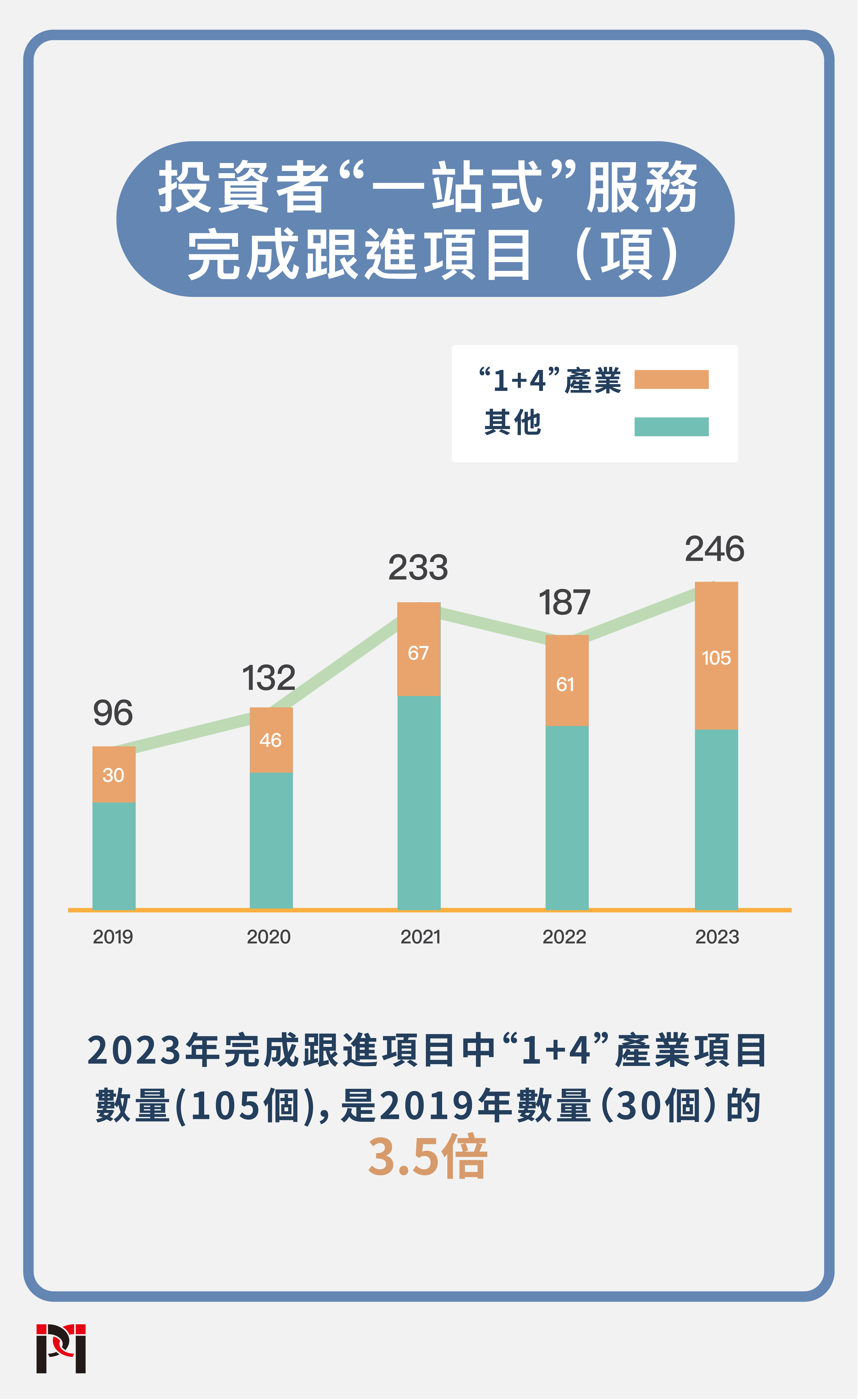 配合“1+4”適度多元發展策略,2023年“投資者‘一站式’服務”完成跟進投資計劃中有105個屬“1+4”產業項目,佔整體(246個)逾四成,是2019年數量(30個)的3.5倍。其中以大健康、高新技術、會展商貿及文化體育產業的升幅較顯著。