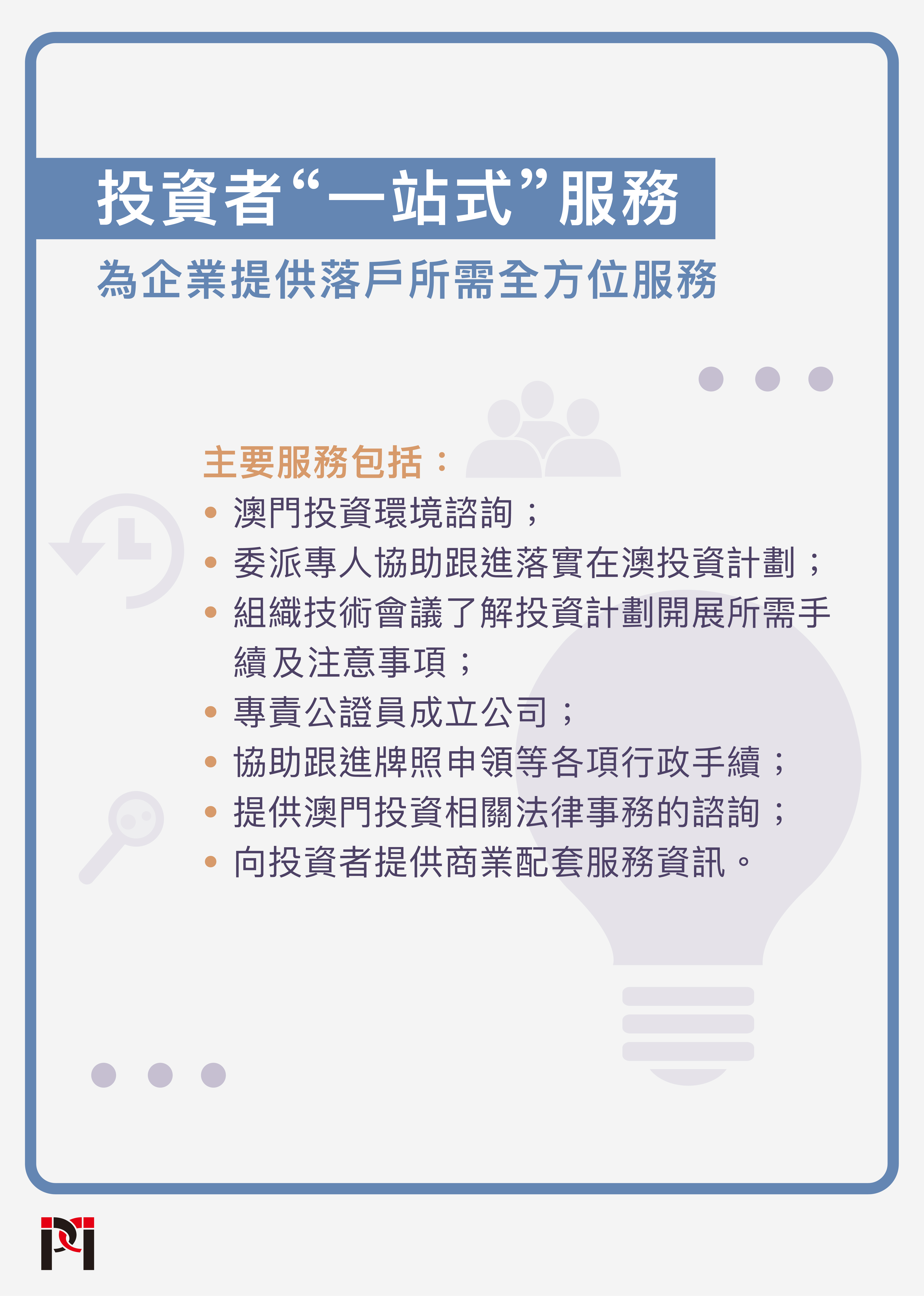 “投資者‘一站式’服務”為海內外投資者在澳落實投資計劃,提供事前、事中、事後全流程“一條龍”服務,主要包括:事前投資環境諮詢、組織事前技術會議;事中安排專人跟進落實投資計劃、協助辦理成立公司及牌照申領等行政手續;事後定期跟蹤項目落實情況,主動關切投資者並提供適切協助,包括跟進二次投資意向、商業配對需求等 。