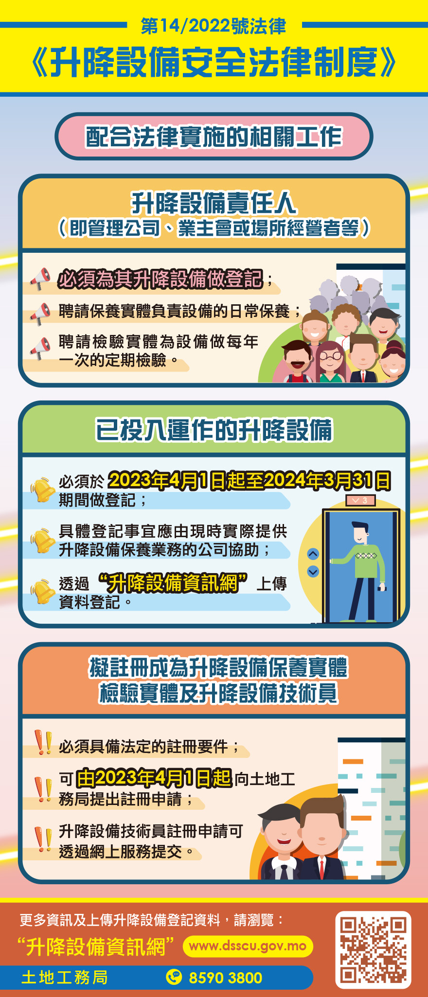 第14/2022號法律《升降設備安全法律制度》將於2024年4月1日起正式實施。責任人須於3月31日或之前為已投入運作的升降設備作登記,包括可透過“升降設備資訊網”的網上服務功能隨時辦理。土地工務局呼籲責任人盡快完成升降設備的登記,以免影響設備使用。此外,按法律規定,原“安全運行證明書”可過渡至有效期屆滿。