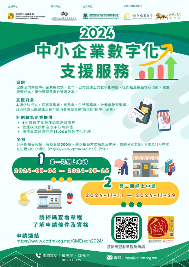 為支持中小企業數字化轉型,經濟及科技發展局委託澳門生產力暨科技轉移中心推出“2024中小企業數字化支援服務”,透過向中小企業提供培訓、診斷服務及免費的數字化解決方案,支持傳統中小企業利用科技工具提升營運效率及拓展業務,賦能企業提質發展。