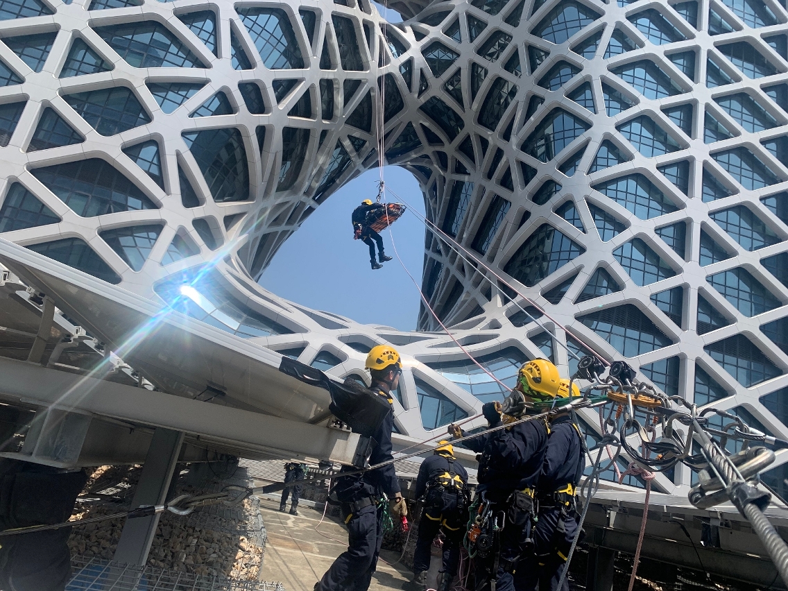 消防局接報後,立即派遣6架緊急車輛及20名隊員趕赴現場,並部署高空拯救隊展開救援行動,最後順利將傷者帶返地面,經進行護理後模擬送院治理。