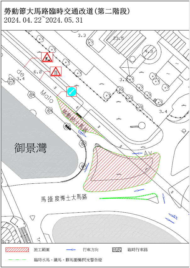 為配合本工程交通管線施工及重舖路面,勞動節大馬路至馬揸度博士大馬路4月22日至5月31日期間分階段實施有限度通車(詳見附圖1及2 )。請駕駛者留意現場交通指示標誌或遵守現場交通警員的指揮及安排。