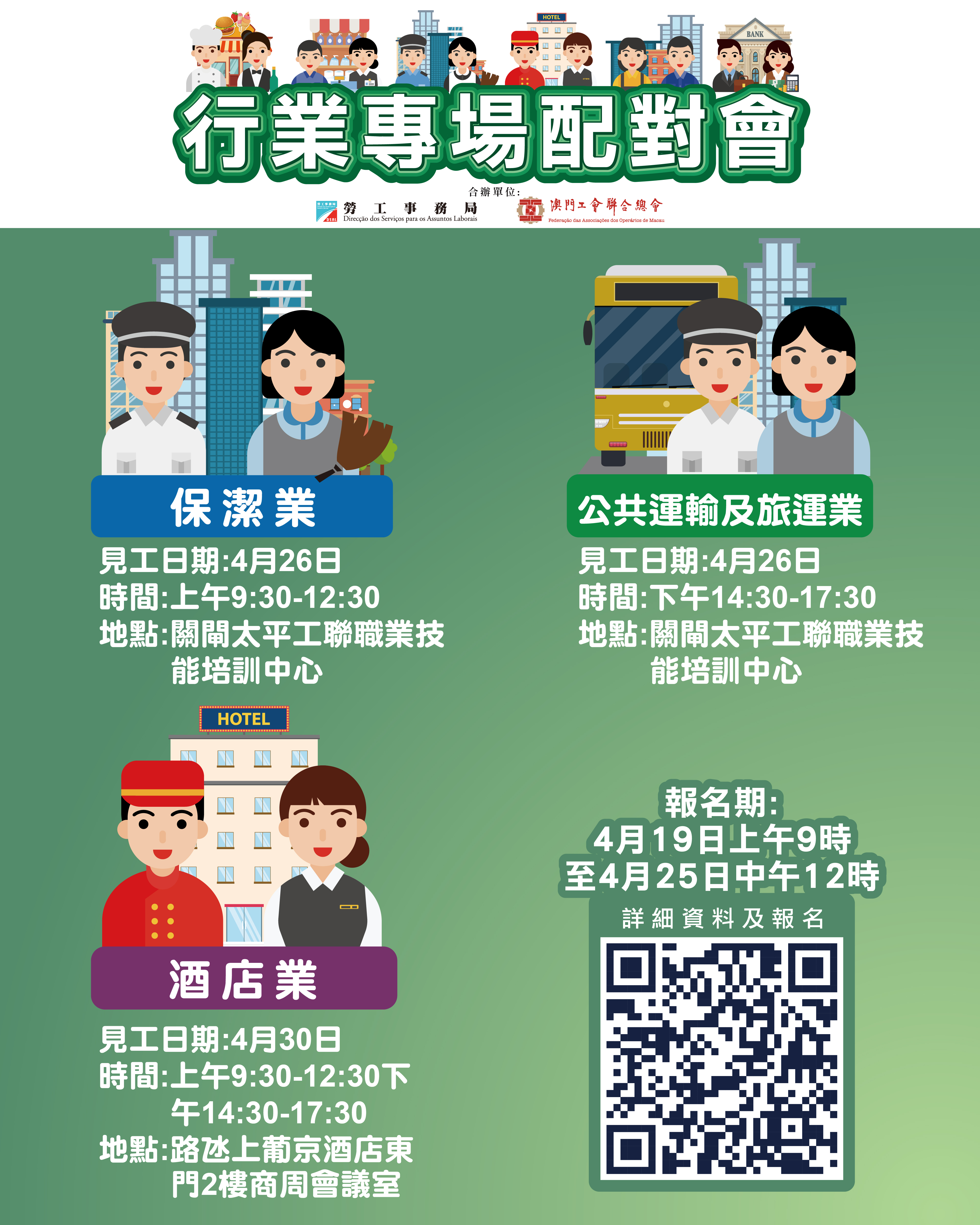 上述4月26日上午保潔業配對會及下午旅運及公共運輸業配對會在澳門工聯職業技能培訓中心(關閘馬路101-105A號太平工業大廈第一期1樓)舉行;4月30日酒店業配對會在澳門上葡京2樓商周會議室舉行。報名日期為4月19日上午9時至4月25日中午12時。