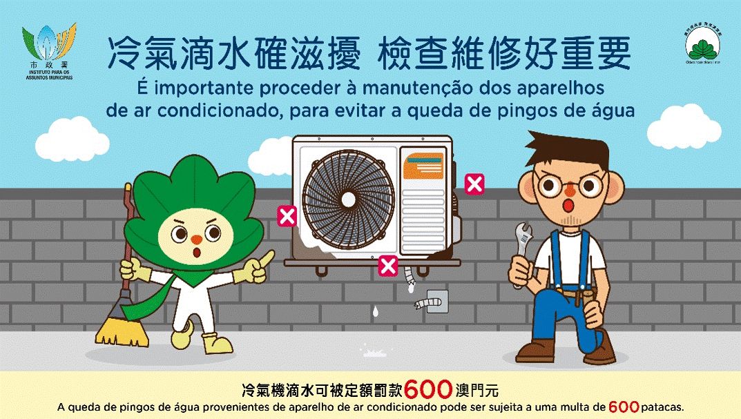 市政署亦持續向社區加強宣傳,透過不同途徑,如張貼海報、派發單張、安裝燈箱廣告及宣傳橫額、邀請本澳團體協助宣傳、在電台播放宣傳聲帶等,向市民宣傳“注意冷氣機滴水”的訊息,又計劃於電視台、巴士、的士、樓宇大堂、超市、市政署轄下設施播放宣傳短片,並上載至市政署網頁宣傳,提醒市民注意冷氣機滴水問題,主動作出改善,避免影響他人。