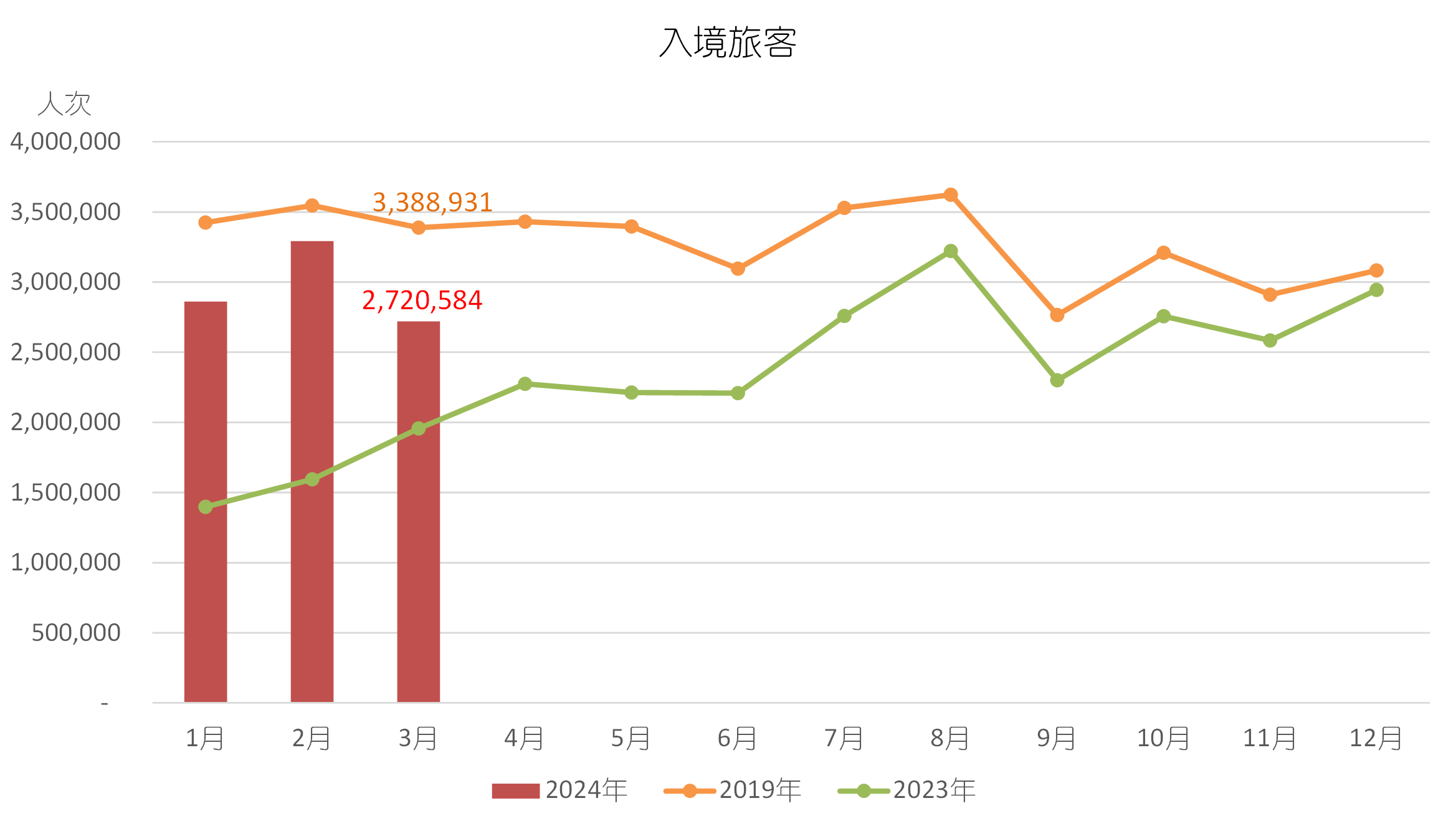 2024年3月入境旅客按年增加39.0%至2,720,584人次,恢復至2019年同期80.3%;與2月比較則下跌17.4%。不過夜旅客(1,443,963人次)及留宿旅客(1,276,621人次)同比分別增加47.7%及30.4%。旅客平均逗留時間維持在1.2日;留宿旅客的平均逗留時間(2.3日)按年增加0.1日,不過夜旅客(0.2日)則減少0.1日。