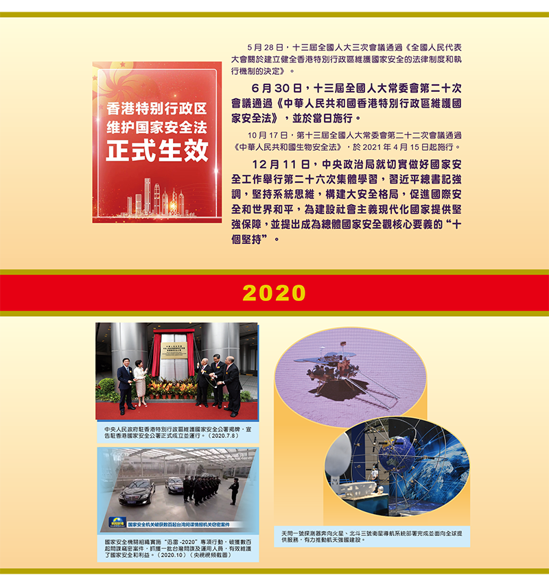 是次展覽共分為前言和五個專題部分,其中,第二部分以“ 全面塑造高水平安全 扎實推進高質量發展”為主題。國家安全是頭等大事,2014年4月15日,習近平主席創造性提出總體國家安全觀,為新時代國家安全工作指明了方向。