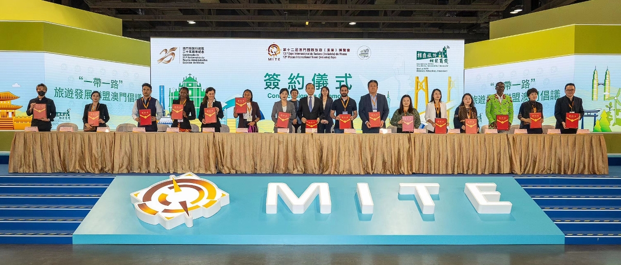 昨(27日)午在旅博會場館內逾80個文旅相關機構和社團參與簽約儀式,藉此推進澳門以及來自不同國家和地區政府與業界之間的業務合作,簽訂逾30份涵蓋旅遊、大健康、航空、研學、婚慶等7個組別的合作項目,其中17個“一帶一路”國家現場展商及買家同共簽署《旅博會“一帶一路”旅遊發展聯盟澳門倡議》。中央人民政府駐澳門特別行政區聯絡辦公室經濟部副部長楊皓、旅遊局局長文綺華及澳門旅行社協會會長劉雅煌見證簽約儀式。