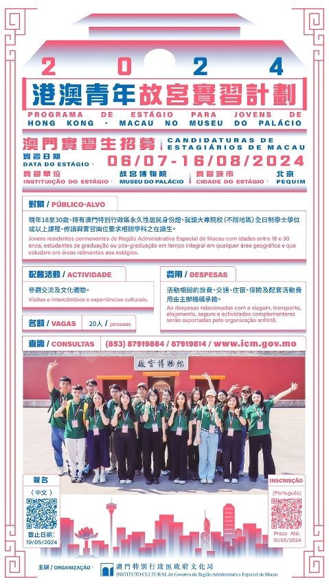 由澳門特別行政區政府文化局、香港特別行政區政府民政及青年事務局聯合主辦的“港澳青年故宮實習計劃 2024”將於7月6日至8月16日舉行,即日起至5月19日接受符合條件的澳門青年報名,實習計劃可提供申請的崗位包括故宮博物院宣傳教育部、文創事業部、世界遺產監測部、古建部、考古部、宮廷歷史部、國際交流處及研究室等8個部門,涉及17種博物館的工作範疇。