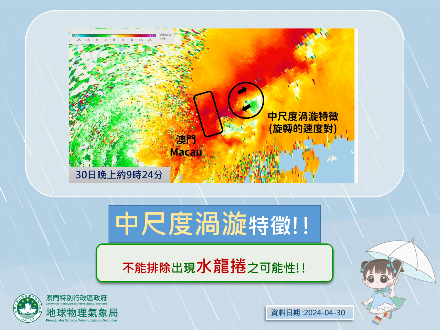 在是次強對流天氣過程中,本澳錄得頻密的閃電、強烈陣風及冰雹(圖1);同時根據雷達監測資料顯示,澳門半島以東海面曾出現中尺度渦漩現象,故不能排除出現水龍捲之可能性。(圖2)