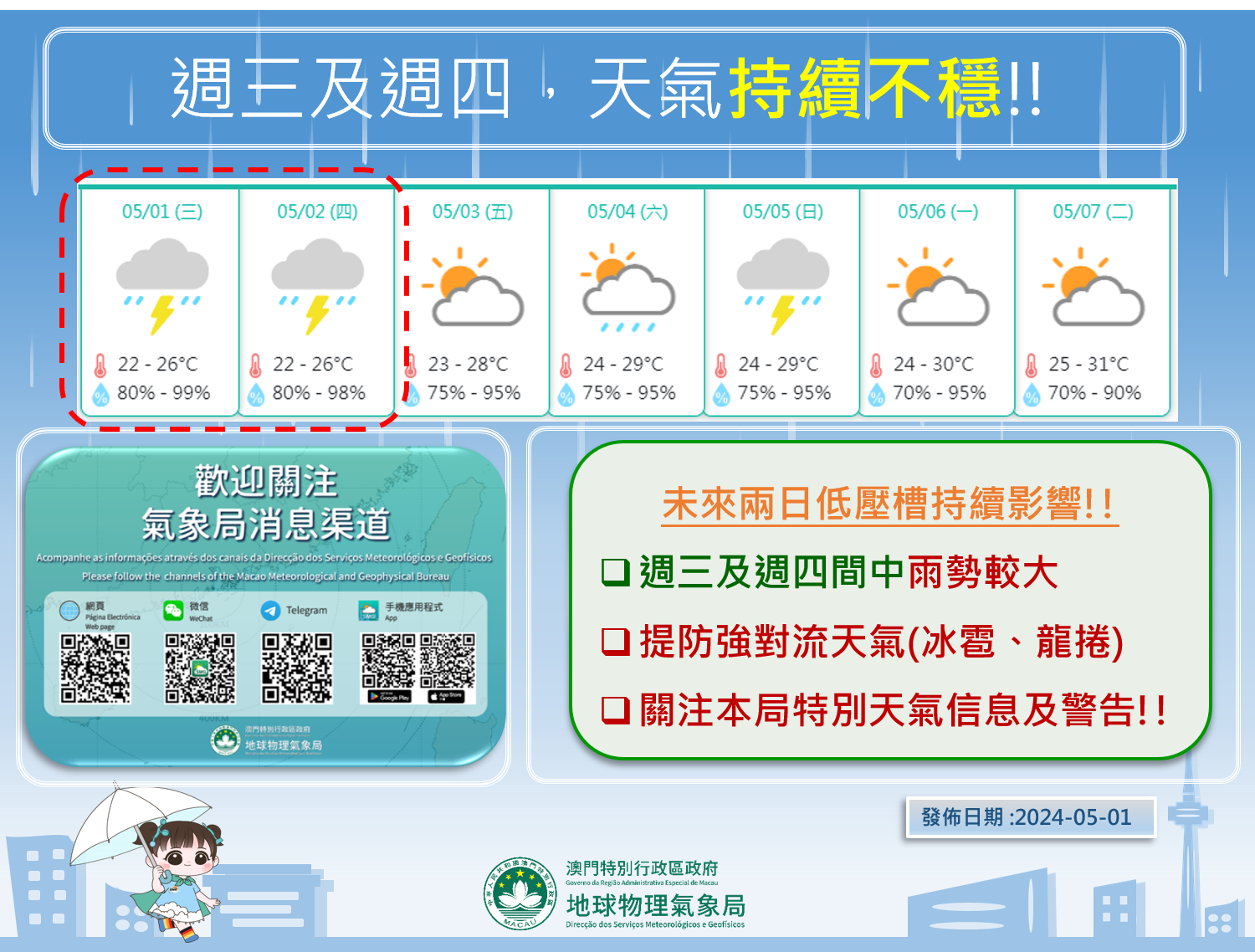 預料低壓槽將持續於未來兩日影響本澳,珠三角地區天氣仍然不穩定,會有驟雨及雷暴。適逢勞動節假期,氣象局呼籲市民出門前要加倍留意天氣變化,並持續關注局方的特別天氣信息及天氣警告。(圖4)