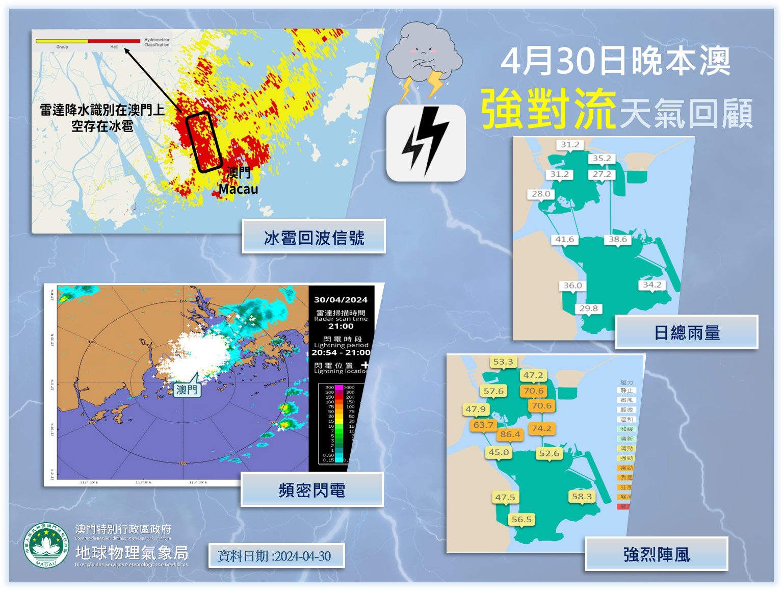 受一道低壓槽影響,本澳30日晚間出現強對流天氣。氣象局於19:25開始發出特別消息,及於20:45發出冰雹預警信息,再先後發出黃色及紅色暴雨警告信號。期間,除了出現短時強降雨及強烈陣風外,於21:20前後,本澳多個地區更錄得冰雹!! 是本澳自2011年(於澳門國際機場錄得)以來,再次錄得同類現象。