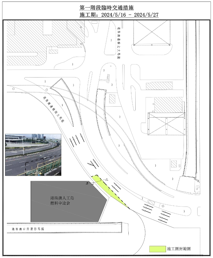 為配合工程的雨水排水管接駁工作,港珠澳邊境南大馬路(入境車道)5月16日至6月7日期間,將分階段實施有限度通車(詳見附圖1及2 )。請駕駛者留意現場交通指示標誌。
