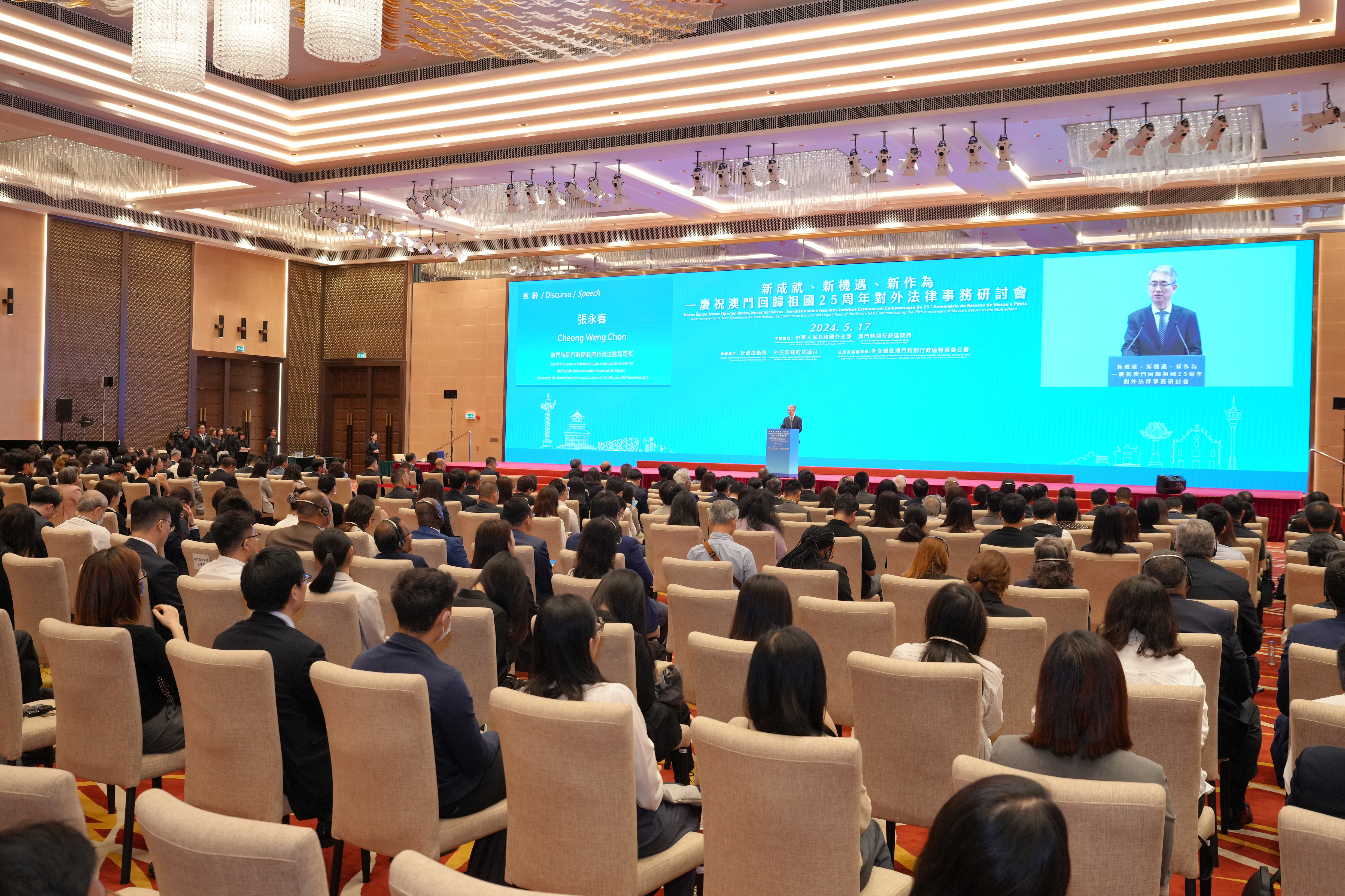 為慶祝澳門回歸祖國25周年,澳門特區政府與外交部今(17日)在澳門共同舉辦“新成就、新機遇、新作為——慶祝澳門回歸祖國25周年對外法律事務研討會”。外交部部長助理苗得雨、澳門特區政府行政法務司司長張永春、香港特區政府律政司司長林定國出席開幕式並致辭,聯合國副秘書長兼聯合國法律顧問蘇亞雷斯在開幕式視頻致辭。外交部駐澳門特區特派員公署特派員劉顯法出席開幕式。