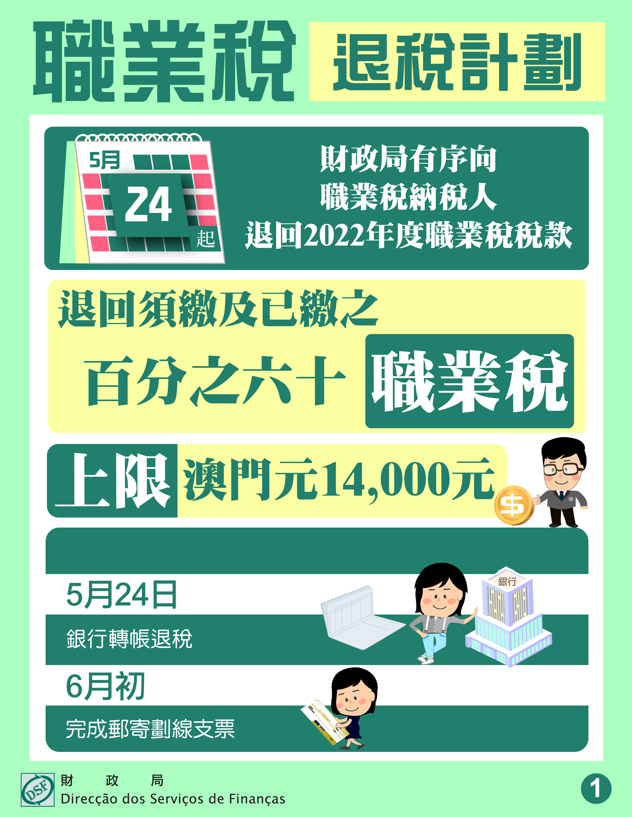 根據第22/2023號法律《2024年財政年度預算案》第二十條的規定,財政局自5月24日起有序向2022年12月31日持有澳門居民身份證的約158,400名職業稅納稅人,退還2022年度須繳並已繳納的職業稅稅款百分之六十,上限為澳門元14,000元,涉及退稅總金額約澳門元9.16億元。
