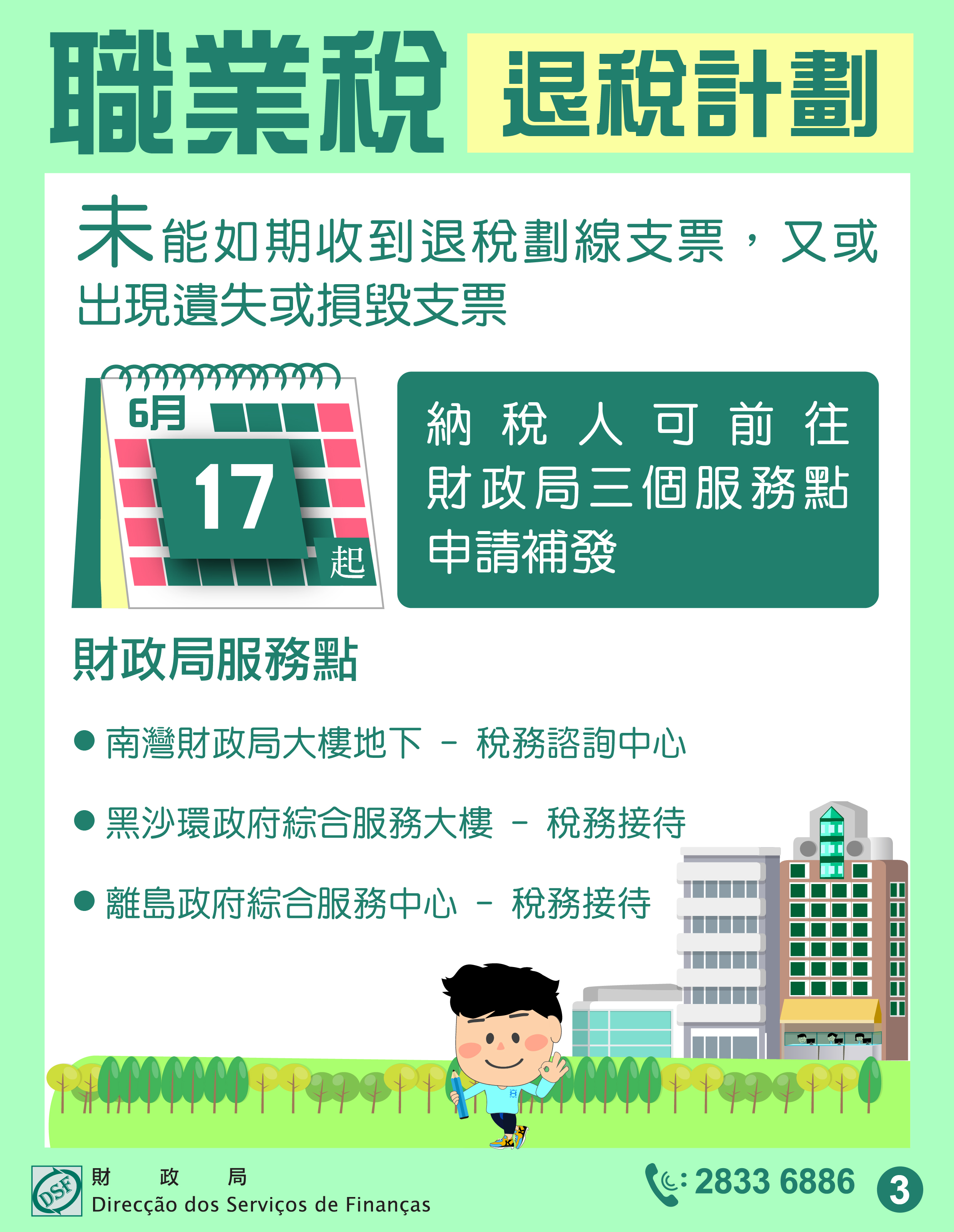 倘納稅人未能如期收到退稅劃線支票,又或出現遺失或損毀支票等情況,可自6月17日起前往財政局三個服務點申請補發支票。