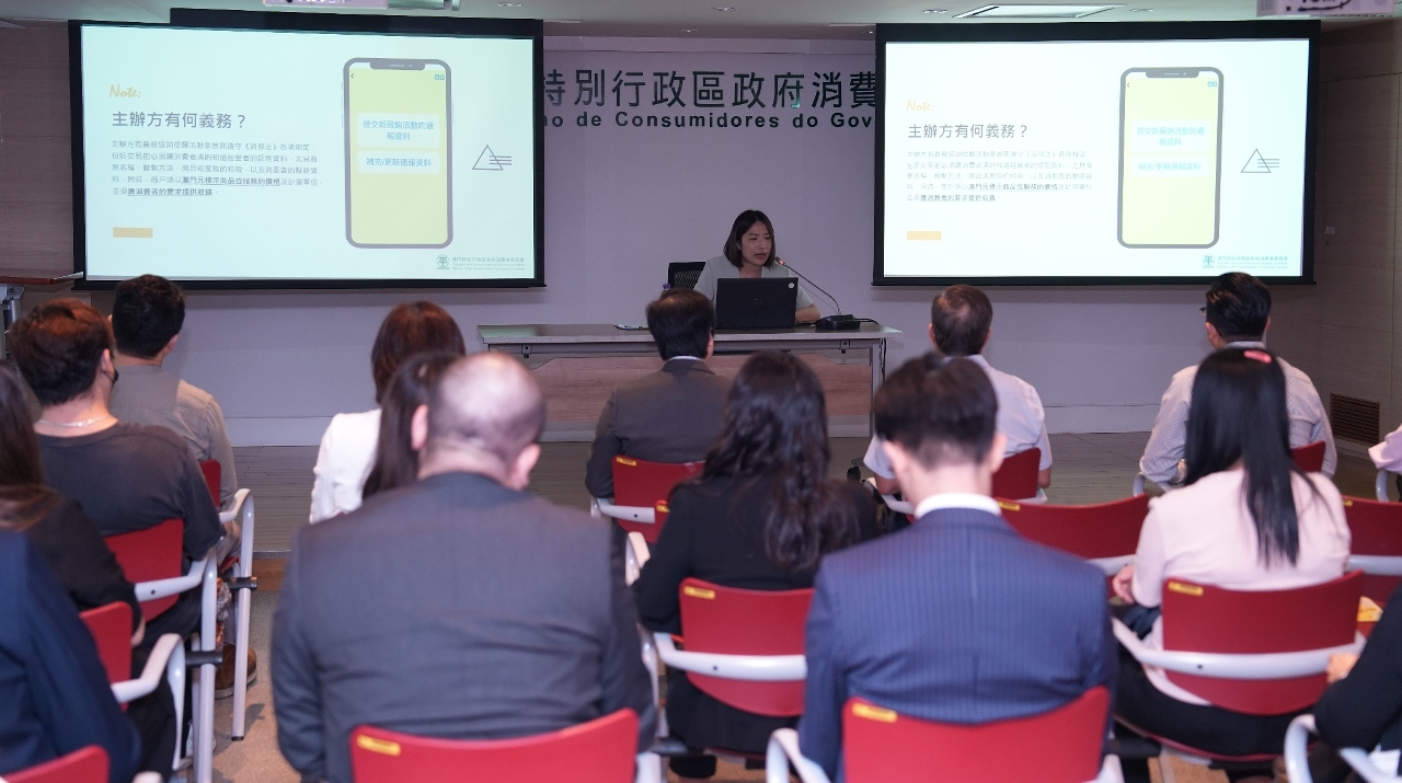 按《消保法》規定,在本澳舉行的展銷或展覽的銷售活動,主辦實體須於活動開始前至少兩個工作日,向消委會提供活動舉行地點、開始及結束日期,以及參展商的認別資料、地址及聯絡方法。消委會月前推出“展銷或展覽的銷售活動通報”網上服務,為讓業界更有效使用服務,消委會舉辦講解會,向業界介紹該服務簡易及便捷等優點。