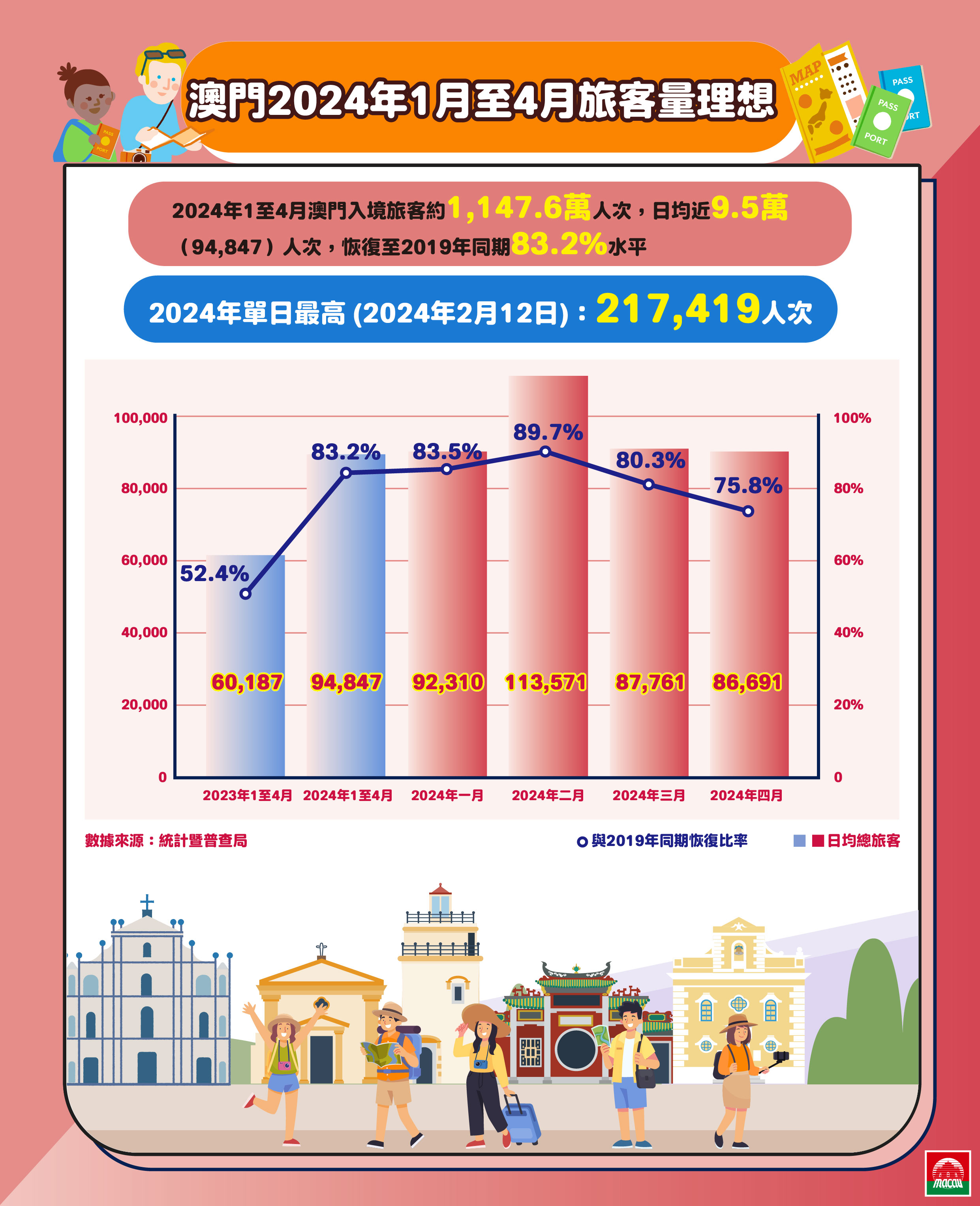 臨時數據顯示,2024年1至4月澳門的入境旅客約1,147.6萬人次,日均近9.5萬(94,916)人次,整體旅客按年同比增加59.0%,並恢復至2019年同期83.2%水平。