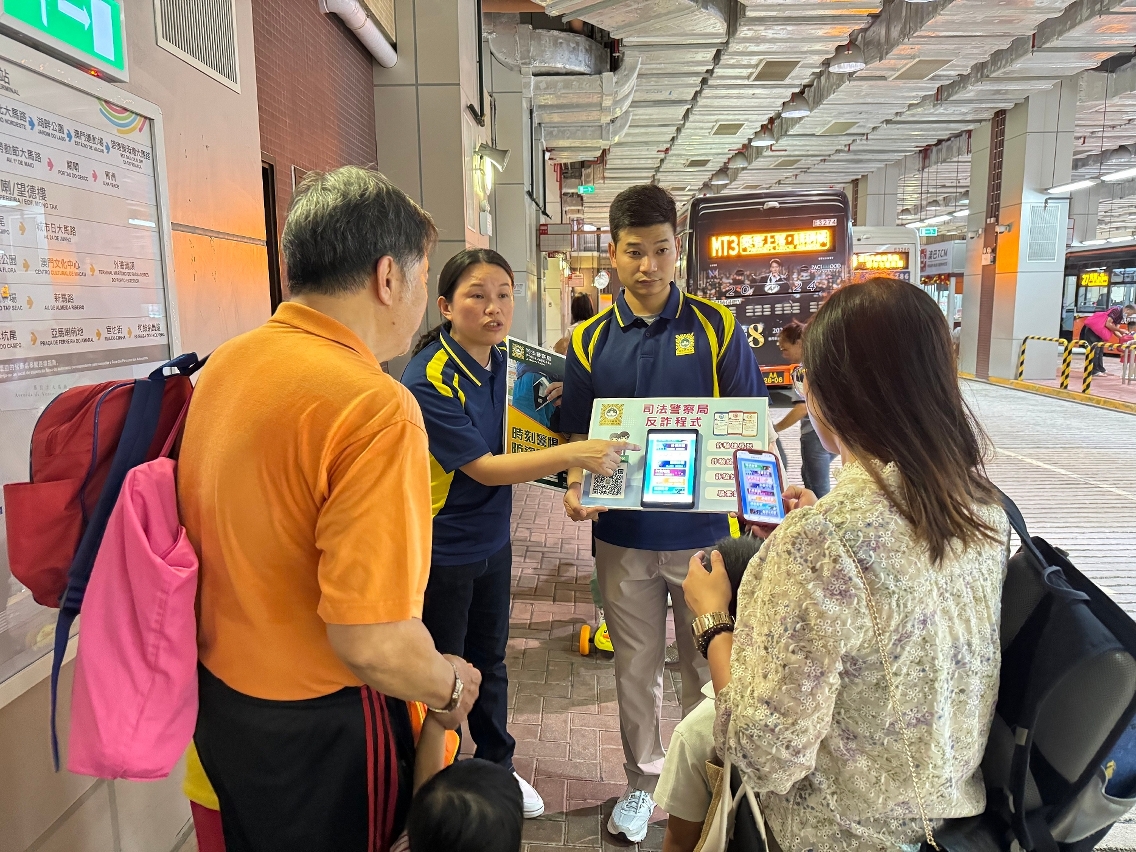 此外,司警局人員亦向市民介紹局方推出的“反詐程式”。程式涵蓋四大功能,包括“詐騙搜尋器”、“詐騙線索上報”、“詐騙知多D”以及“騙案識別”,市民可利用當中的“詐騙搜尋器”功能協助分析可疑電話號碼、電郵、銀行帳戶號碼等的詐騙風險指數,亦可從程式中了解電訊網絡詐騙的作案手法和預防方法,以及透過模擬騙案掌握各種實用的防騙技巧。司警局人員鼓勵市民善用程式並與親友分享,幫助他們識別和應對各種電訊網絡詐騙陷阱。市民如懷疑遇到詐騙,亦可透過程式中的詐騙線索上報功能、司警局報案熱線993或防詐騙查詢熱線88007777向局方提供線索;若遭詐騙侵害,請即到司警局報案求助。