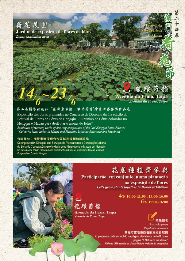 由市政署舉辦的“盛世蓮花迎雙慶─第二十四屆澳門荷花節”將於六月十四日至二十三日在氹仔龍環葡韻舉行,期間在本澳多處擺放盆荷供遊人觀賞,同時安排一系列展覽和活動,內容豐富,動靜皆宜,歡迎市民踴躍參與。