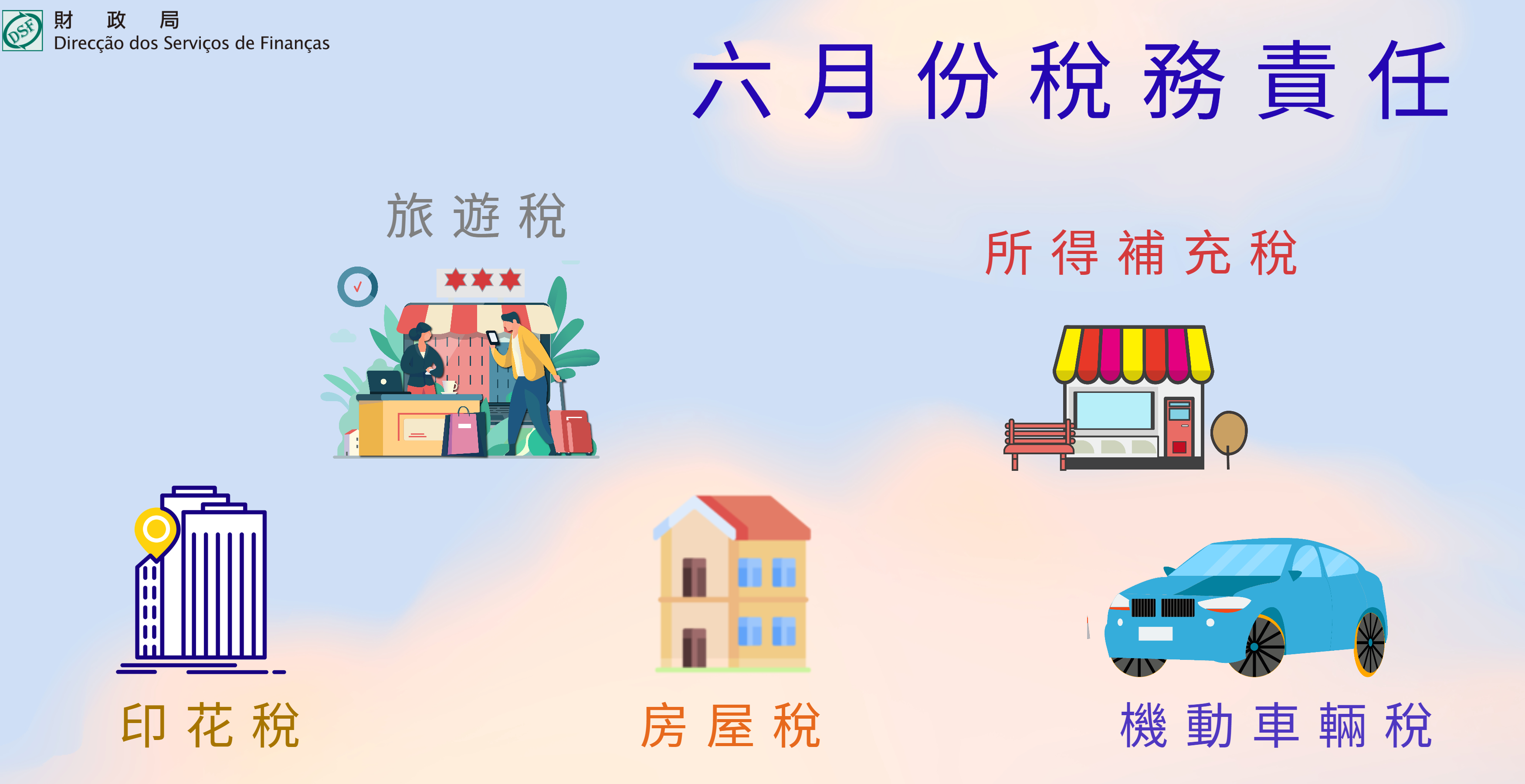 第8/2021號法律《酒店業場所業務法》、四月一日第16/96/M號法令及十月二十六日第47/98/M號法令所規範的酒店、舞廳、酒吧、健康俱樂部、蒸氣浴室、按摩院及卡拉OK等場所直接或間接提供的財貨及服務,應繳納上月份百分之五旅遊稅及遞交M/7格式申報表。(經第11/2022號法律修改的第19/96/M號法律通過的《旅遊稅規章》第十二條) |
