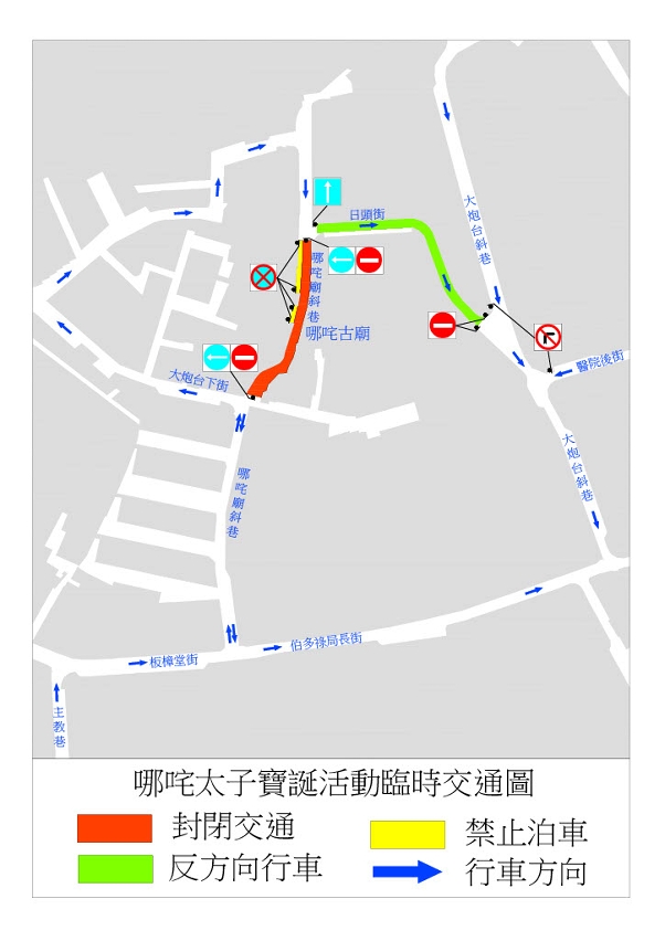 禁止自大炮台斜巷及醫院後街之車輛進入日頭街;欲往哪咤廟斜巷、大炮台下街及日頭街之車輛應取道板樟堂街。 |