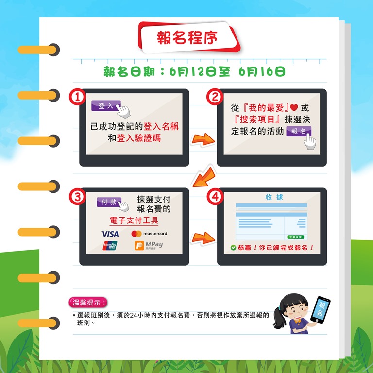主辦單位提醒報名者在報名前,須備妥電子支付工具繳費,宜提前瀏覽課程資訊和將心儀的活動加入“我的最愛”,以及準備好已成功登記的登入名稱和登入驗證碼,以便完成網上報名。