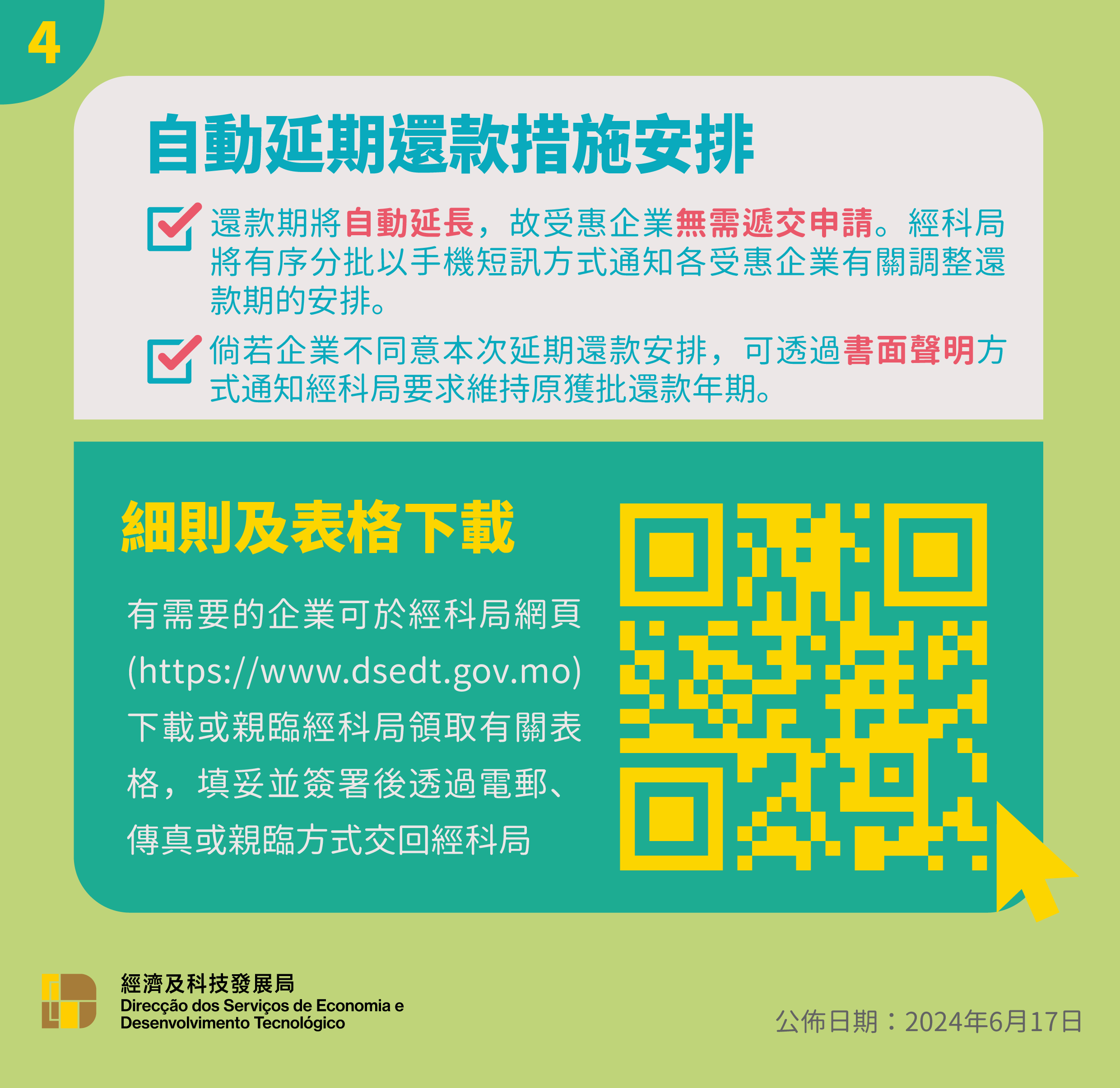 有關是次自動延長還款期措施的詳情、問題集、圖文包等資訊將上載至經科局網站自動延長還款期措施專區。如有任何查詢,可於辦公時間內致電2888 2088或透過微信服務號“DSEDTONLINE”與經科局聯繫。
