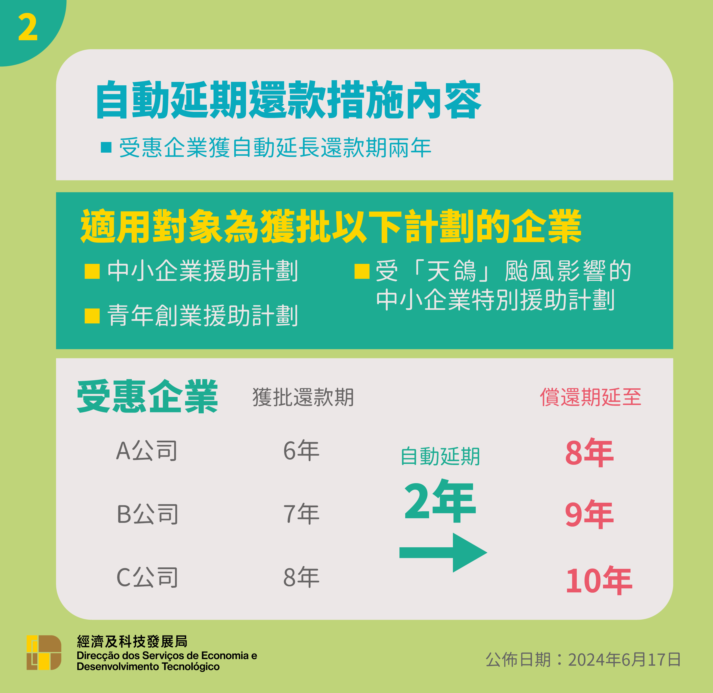 對於現時仍處於還款期的受惠企業,有關個案的原批給還款期將自動延長兩年,其援助款項結欠餘額將按尚餘期數平均攤還,讓企業更好逐步清償貸款,支持中小企業穩步渡過疫後復甦期。為着便民便商目的及優化行政手續,受惠企業無須就是次還款年期調整提出申請。