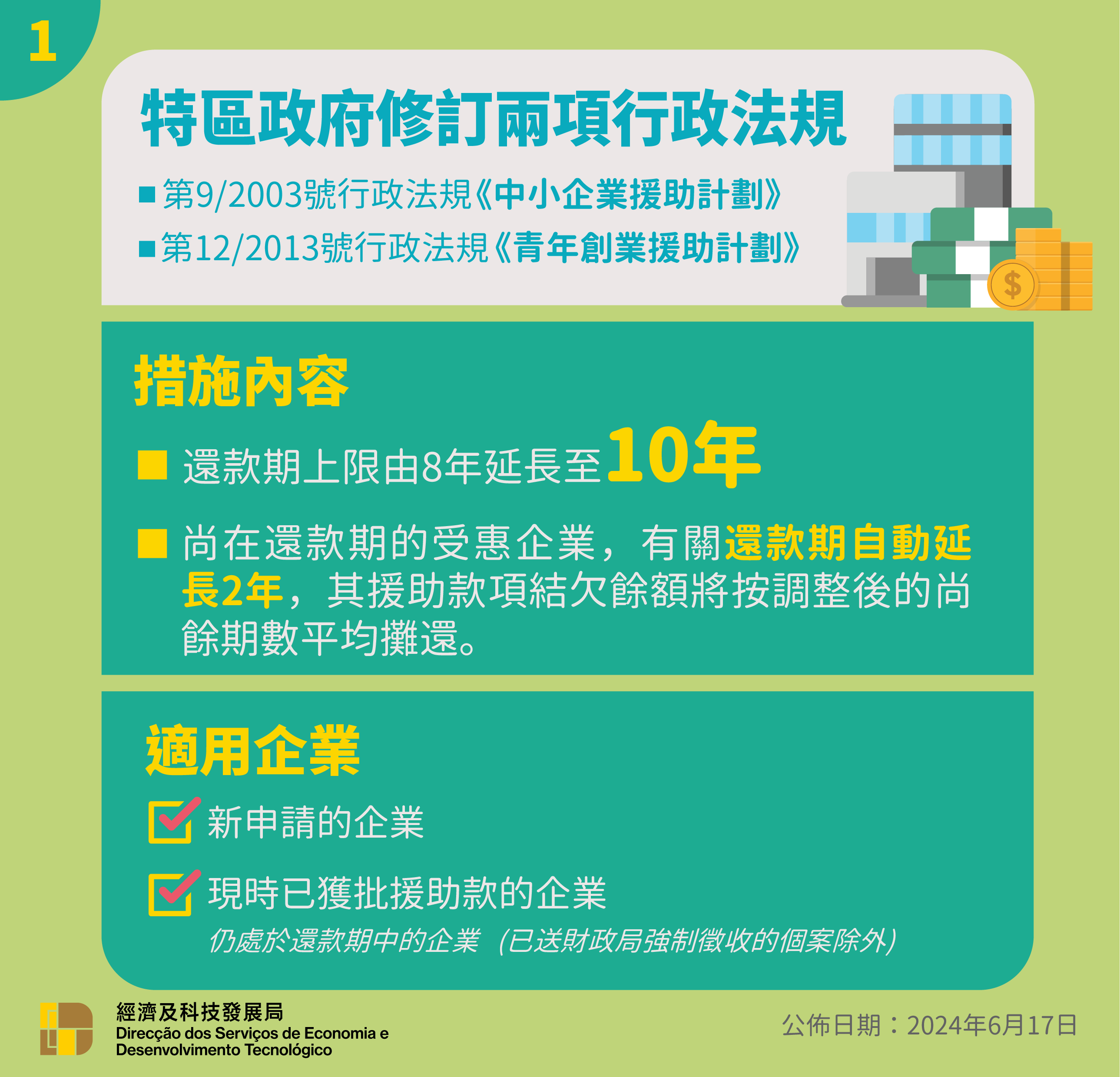 為紓緩中小企業償還貸款的壓力,特區政府透過第22/2024號行政法規《修改第9/2003號行政法規〈中小企業援助計劃〉及第12/2013號行政法規〈青年創業援助計劃〉》,將兩項計劃的還款期上限由8年延長至10年,並於2024年6月18日起生效。