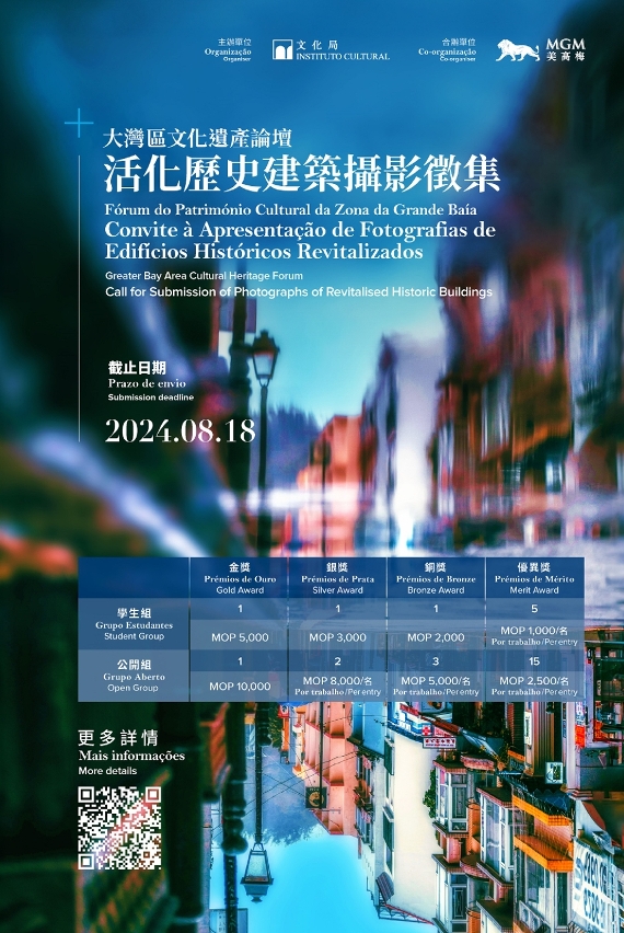 為深化粵港澳大灣區在文化遺產領域的交流與合作,文化局將於10月下旬舉辦“大灣區文化遺產論壇”(以下簡稱“論壇”)及一系列延伸活動,其中包括由文化局主辦、美高梅合辦的“大灣區文化遺產論壇——活化歷史建築攝影徵集展”,展覽徵集以“澳門活化歷史建築”為主題的未經公開發表的黑白/彩色單張照片作品(包括航拍及全景攝影),公眾可於即日起至8月18日提交作品。