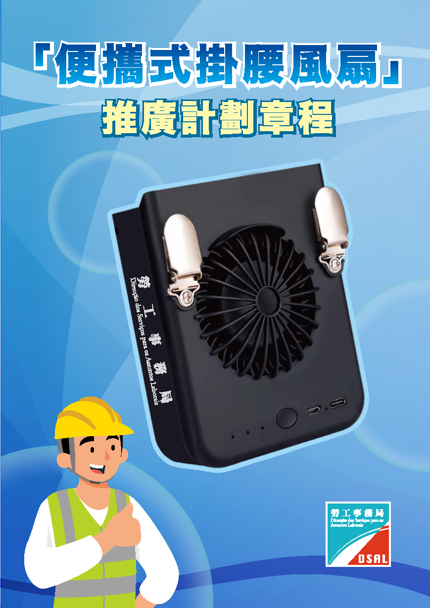 勞工局正推出「抗熱服及防曬帽套」及「便攜式掛腰風扇」推廣計劃,以及備有預防中暑的海報,歡迎巿民索取和張貼於工作場所。如欲獲取更多職安健資訊,歡迎瀏覽勞工局職安健天地網頁www.dsal.gov.mo,亦可致電28717781或電郵dsaldsso@dsal.gov.mo查詢。