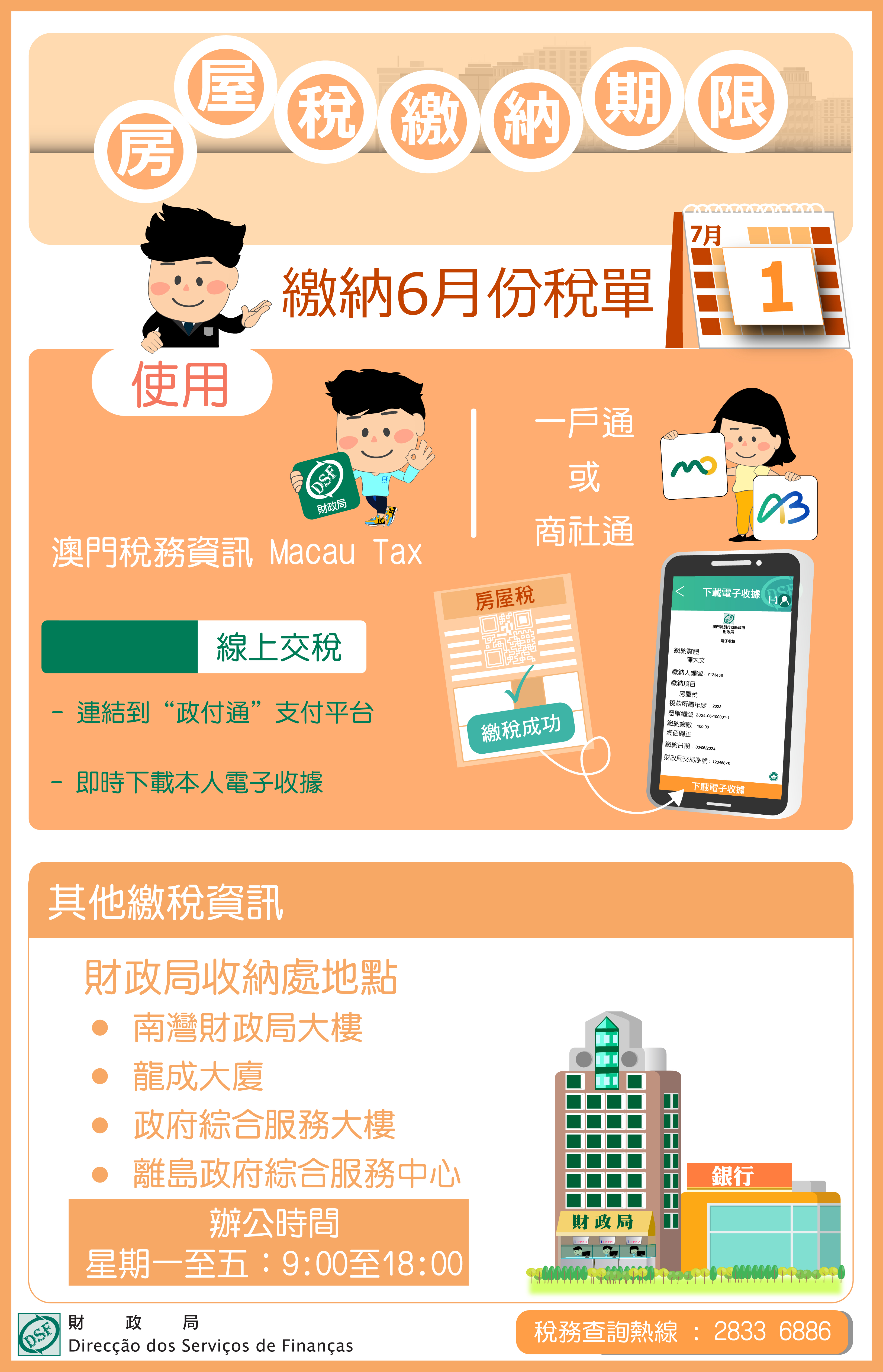 納稅人亦可於銀行辦公時間前往指定銀行櫃位或透過銀行提供的電子交易方式繳納稅款;又或前往南灣財政局大樓、龍成大廈、政府綜合服務大樓及離島政府綜合服務中心的收納處繳稅。