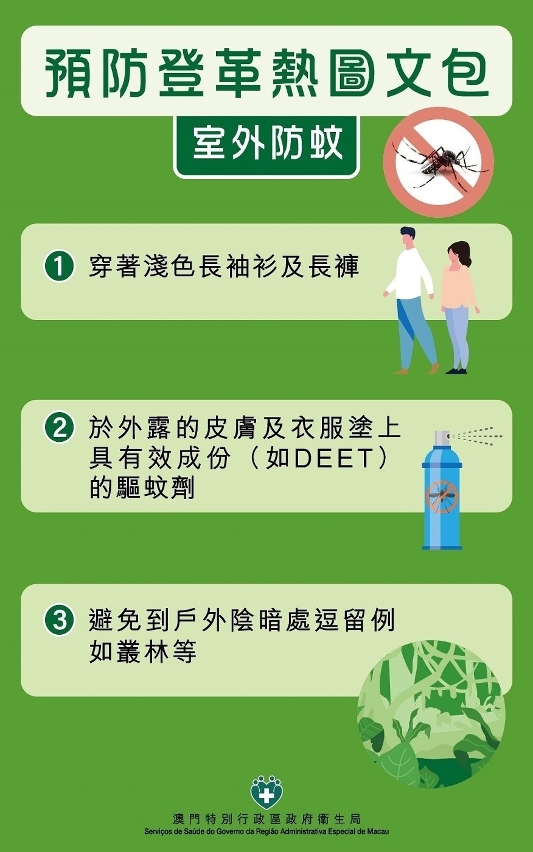 4. 若前往登革熱流行地區,宜穿淺色長袖衫褲,在有空調或防蚊裝置的地方住宿,外出時使用驅蚊劑,防止被蚊叮咬;