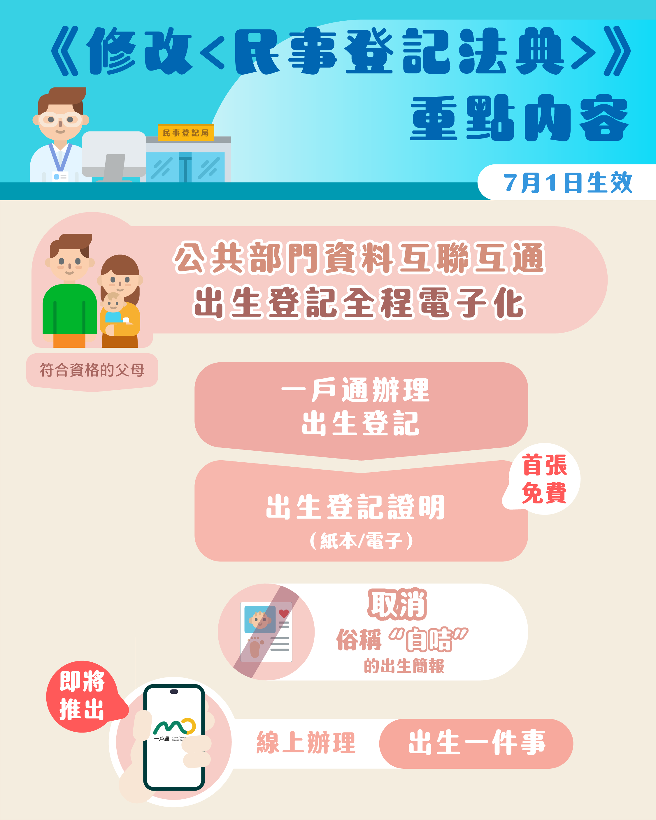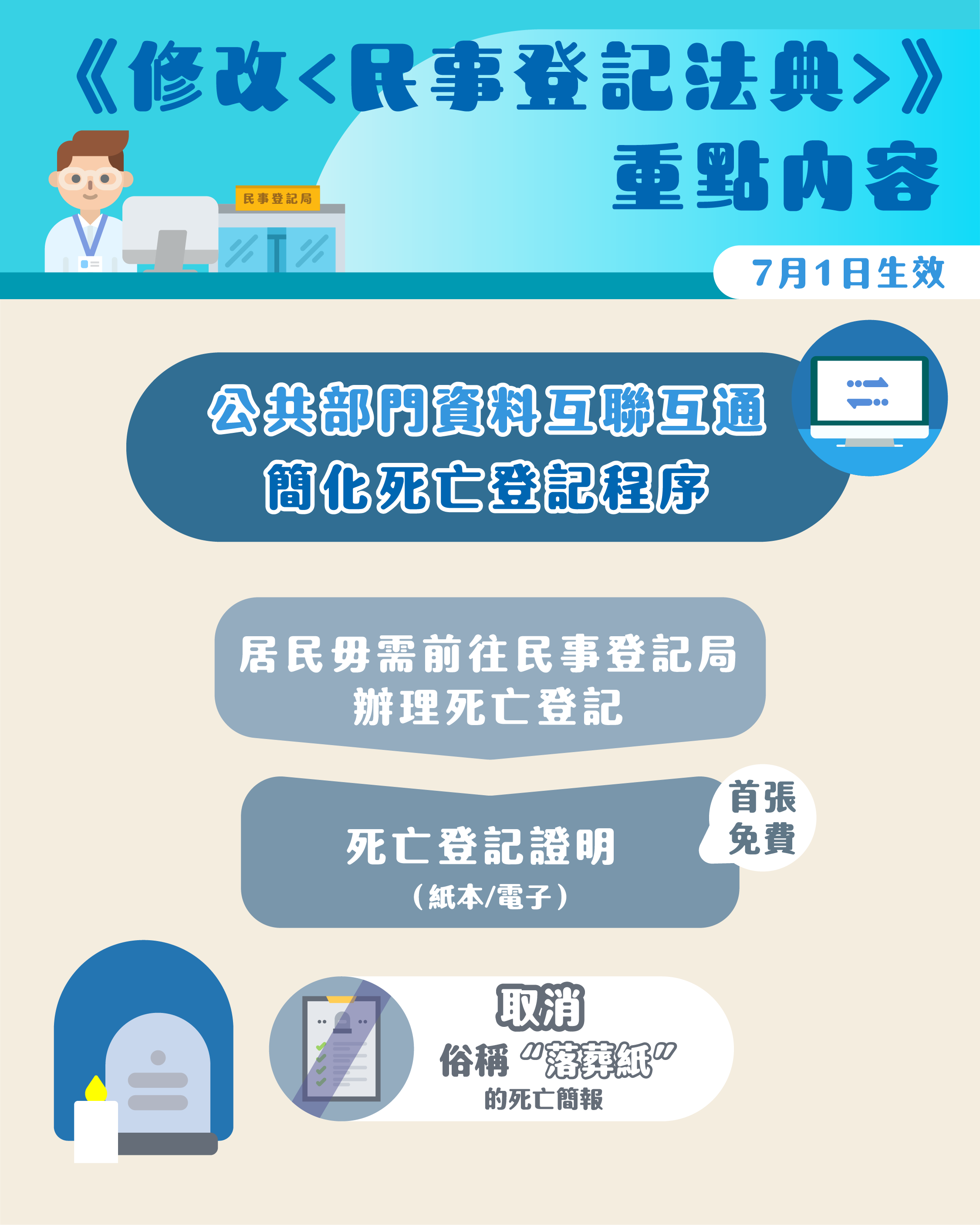 由即日起,居民在結婚申請獲批後,除在民事登記局辦理結婚登記外,亦可由私人公證員在民事登記局以外地方主持結婚;取消出生簡報(俗稱“白咭”)及死亡簡報(俗稱“落葬紙”),民事登記局向申請人免費發出首份證明。同時,隨著法律生效,民事登記局亦與本地醫院建立數據互聯,居民無需前往該局辦理死亡登記。