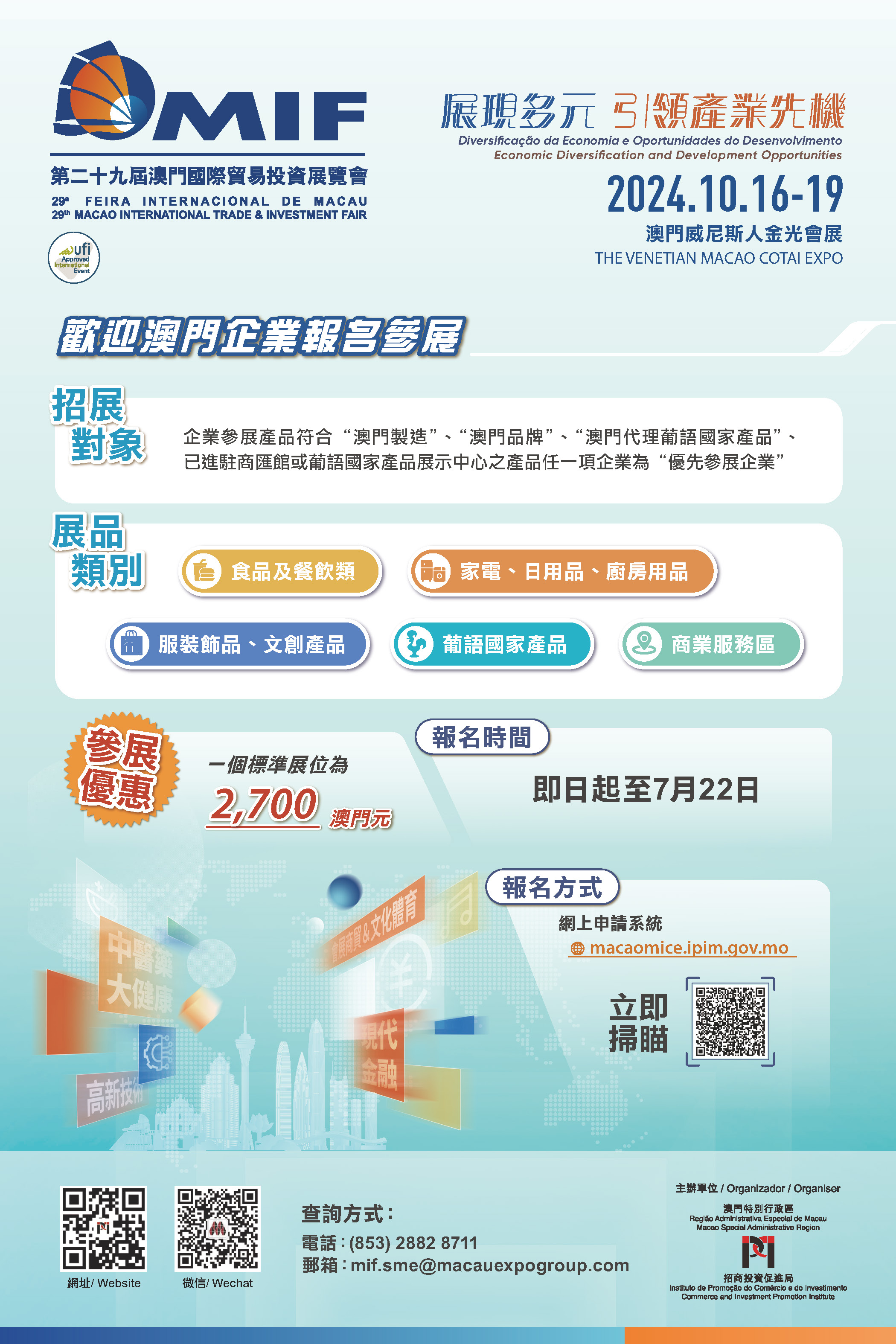 由於展位數量有限,若申請數量超額,將以抽籤形式處理。主辦單位保留有關安排的最終決定權。參展詳情可以致電+853 2882 8711或電郵至mif.sme@macauexpogroup.com查詢。