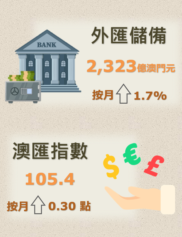 澳門金融管理局今(15)日公佈,2024年6月底澳門特別行政區的外匯儲備資產總額,初步統計為2,323億澳門元(288.8億美元),較2024年5月經修訂總額2,284億澳門元(283.6億美元),上升了1.7%。2024年6月底的外匯資產總額,約相當於2024年5月底澳門流通貨幣的11倍或廣義貨幣供應(M2)中屬於澳門元部分的92.9%。