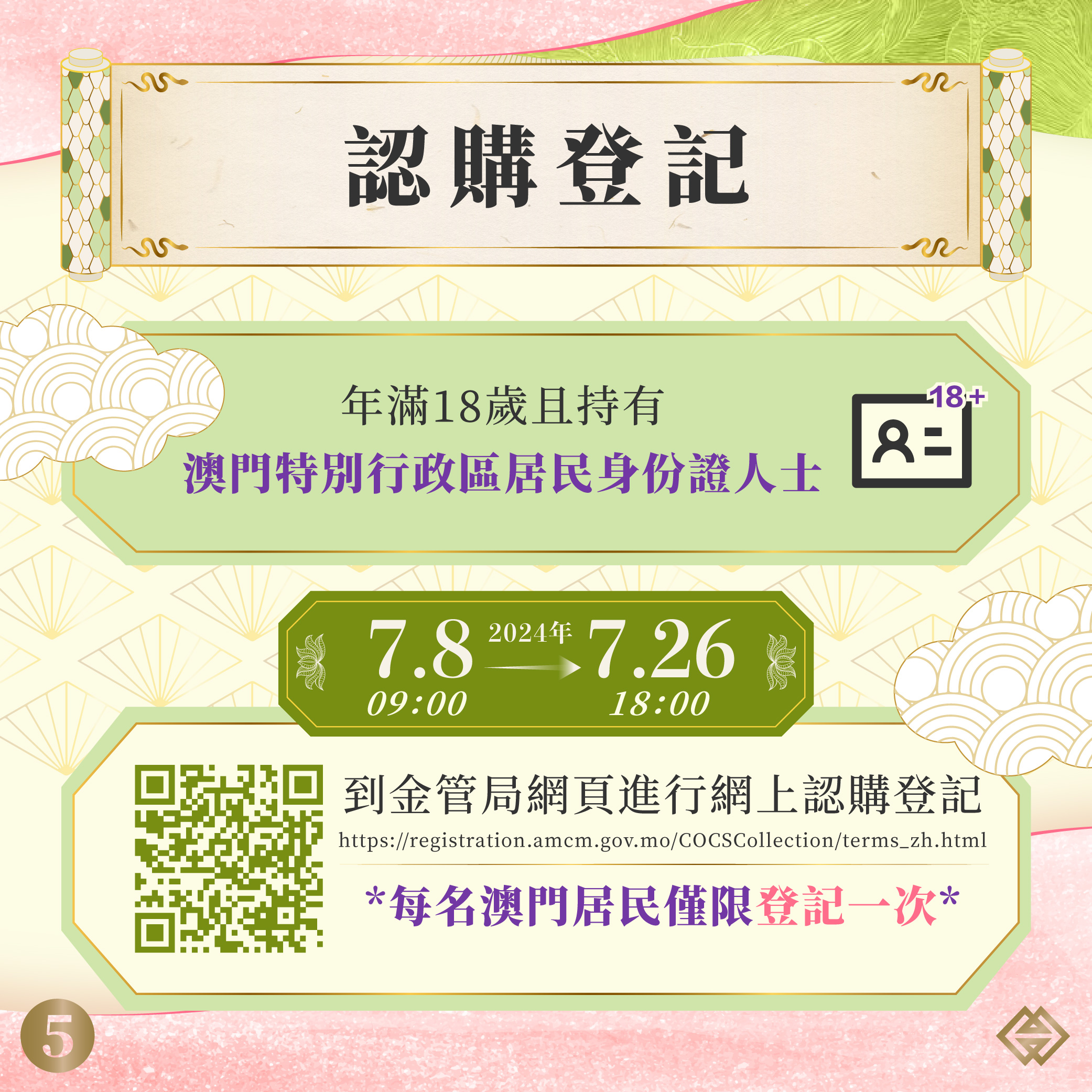 2025乙巳蛇年生肖紀念幣網上認購登記將於7月26日(下週五)下午6時正結束。澳門金融管理局提醒有意登記認購的市民,儘快於認購期限屆滿前辦理網上認購登記(https://registration.amcm.gov.mo/COCSCollection/terms_zh.html)。金管局位於士多鳥拜斯大馬路東曦閣的出納櫃檯將協助有需要的人士辦理登記認購手續。如有任何疑問,可瀏覽金管局網頁,亦可致電金管局專線2856 5071或2856 5072查詢。